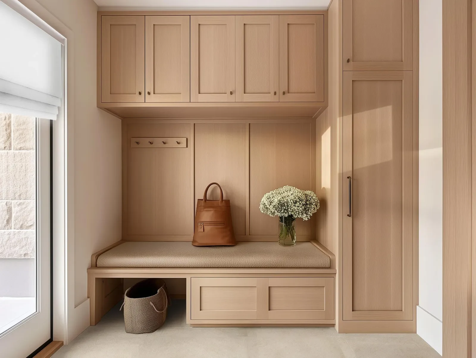 Soft beige wood cabinetry with built-in hooks and a cushioned bench seat creates a welcoming and practical entryway. Enhance your space with these natural textures for a cozy, organized ambiance.