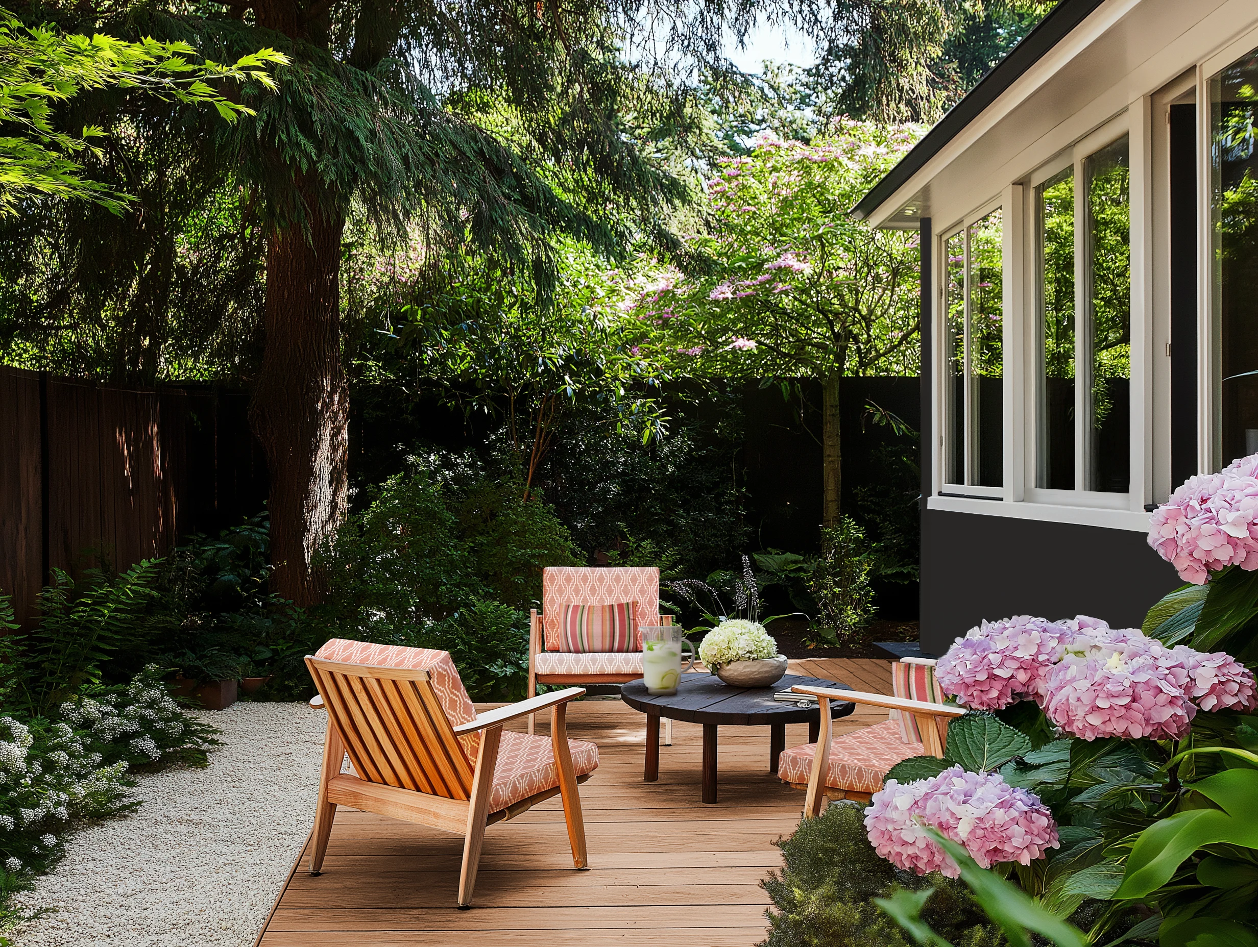A gravel border meets smooth decking under striped pillows and patterned cushions, surrounded by blooming hydrangeas and lush tree canopy.
