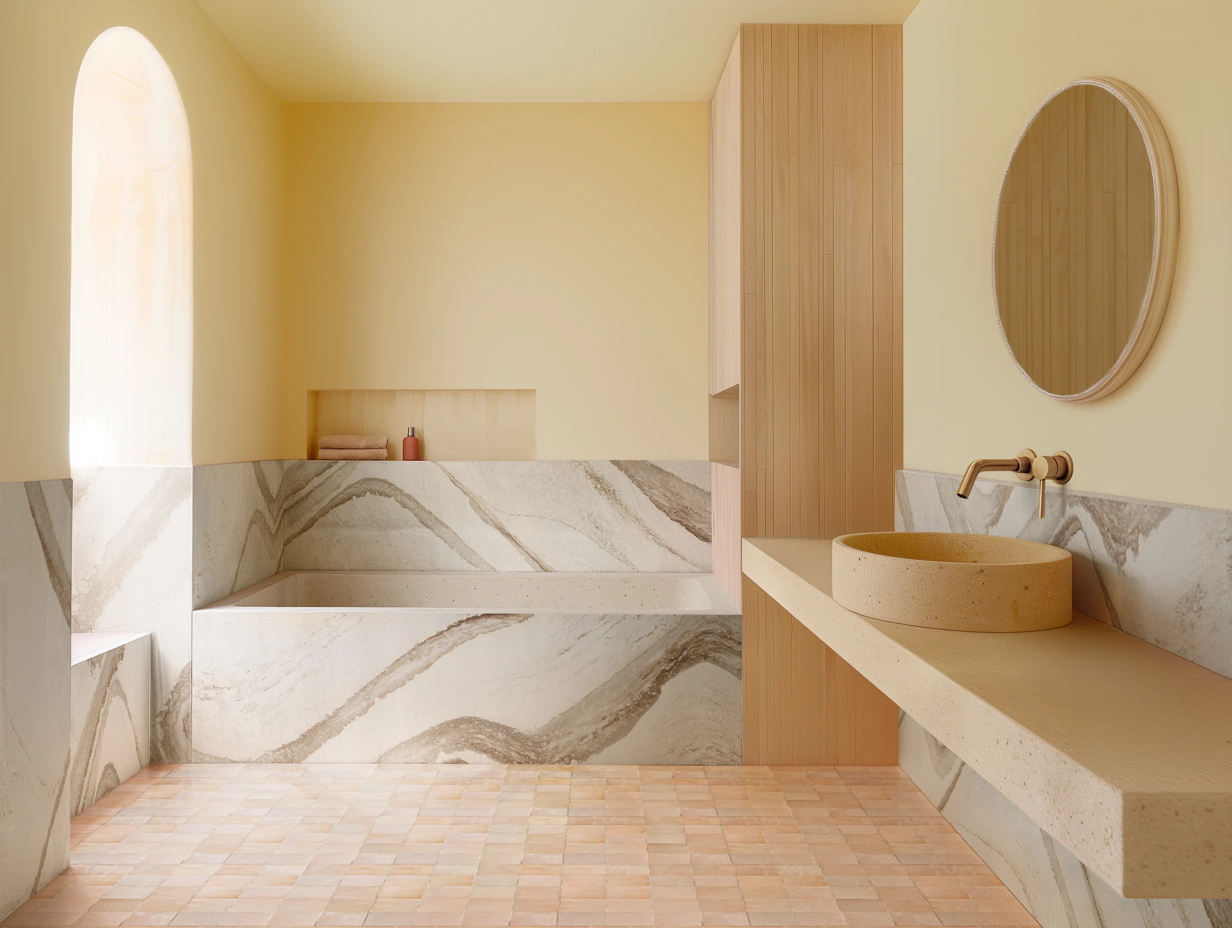 Elevate and brighten your bathroom with light yellow walls, soft pink marble and creamy stone accents. Explore the materials that bring this tranquil space to life.