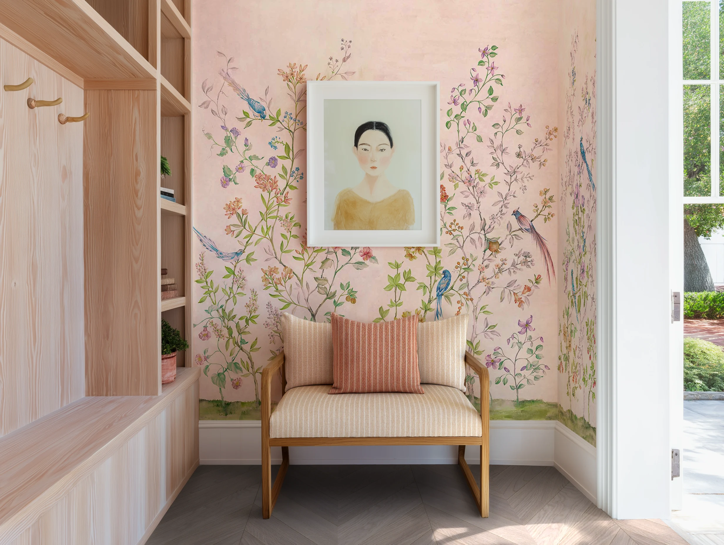 Soft pink wallpaper with delicate birds and blooms sets a romantic tone in this entry nook. A striped cushion bench adds classic charm with a modern touch. Try wallpaper with vintage flair to bring personality to your entryway.