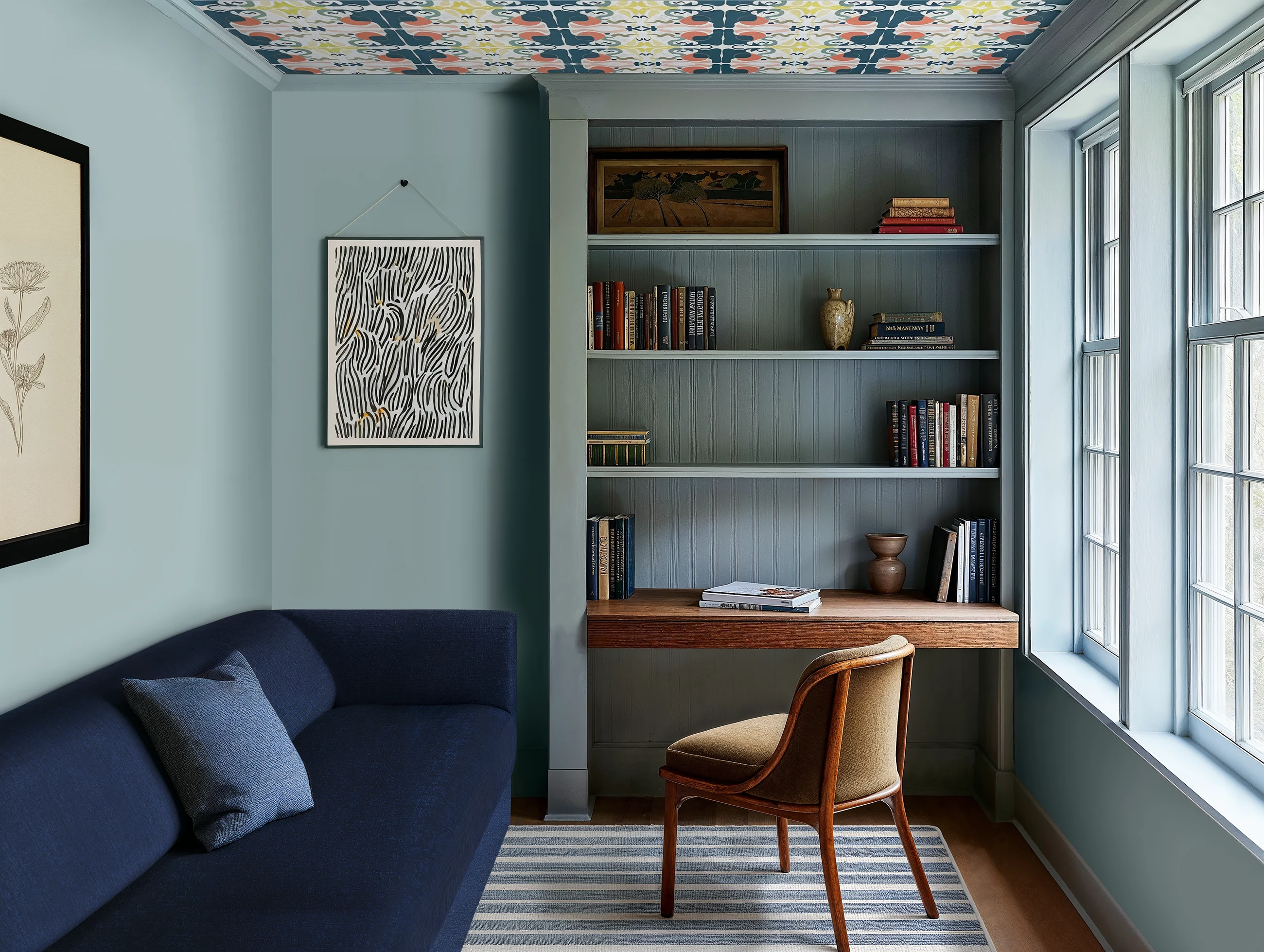 A cozy corner enveloped in soothing blue hues and calming textures, bathed in natural light, this space is enhanced by a vibrant patterned ceiling, creating an inspiring backdrop for creativity and concentration.