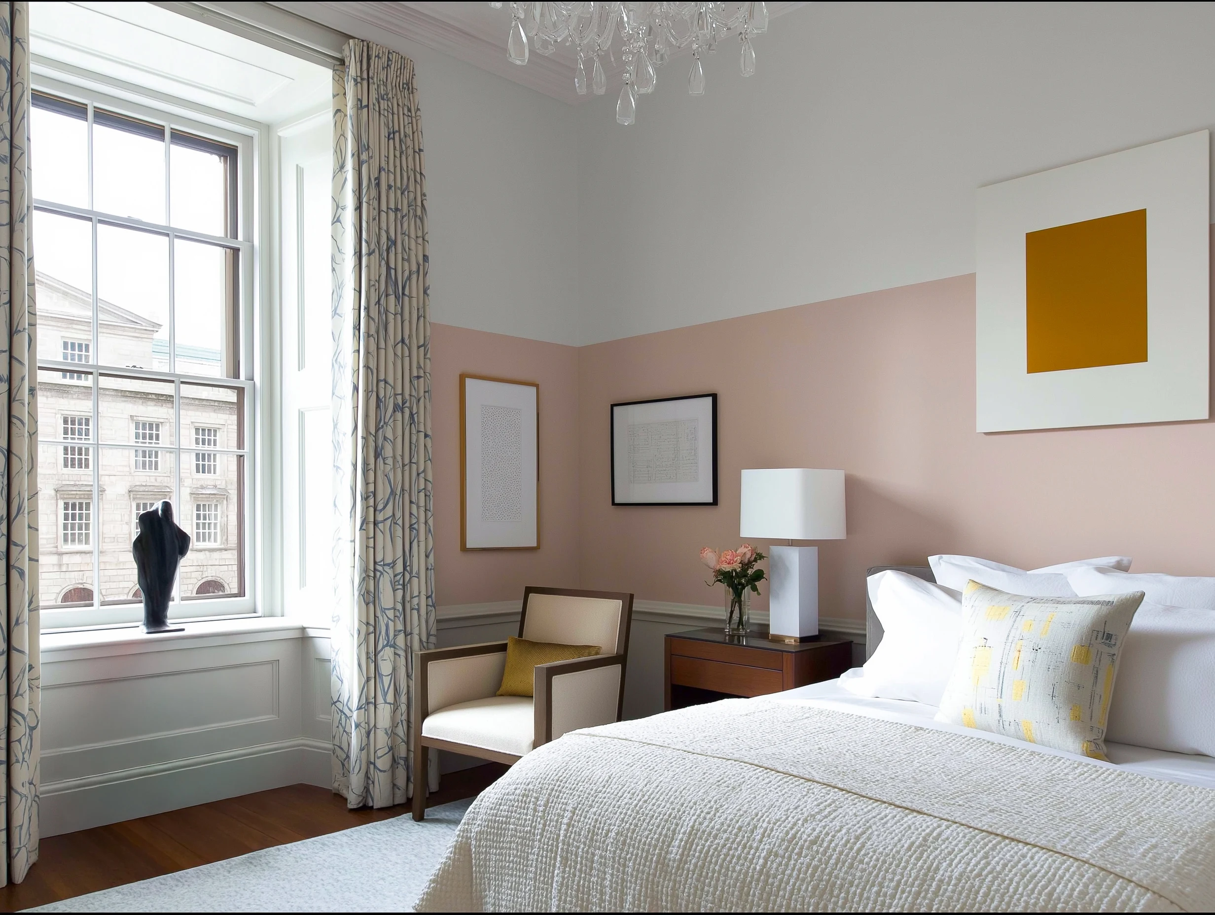 A two-tone wall in blush and white sets the stage for linear drapery, sculptural art, and crisp classic wood flooring.