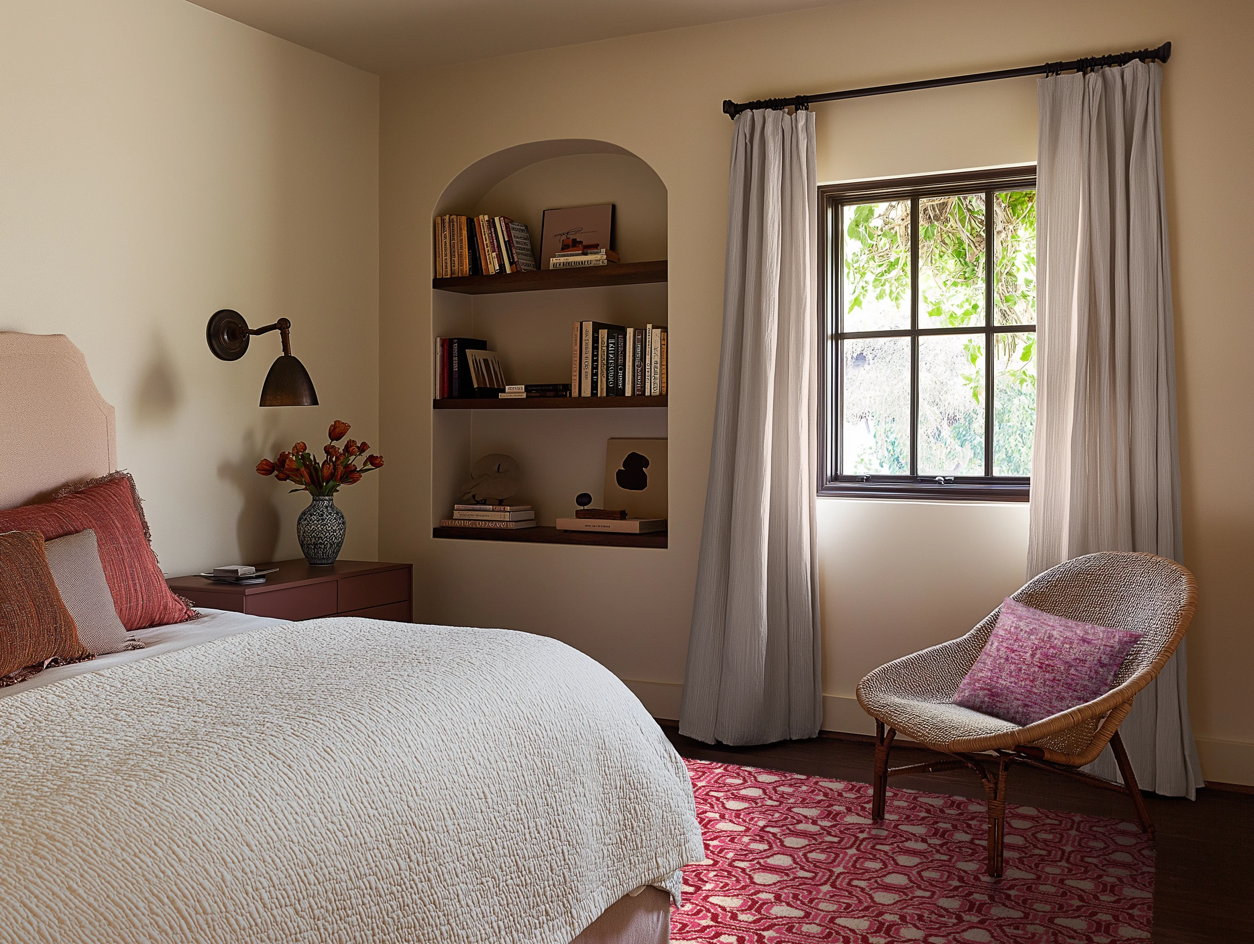 A subdued beige setting frames a sophisticated bedroom nook, accented by a deep mahogany dresser and a bold fuchsia rug for dynamic contrast.