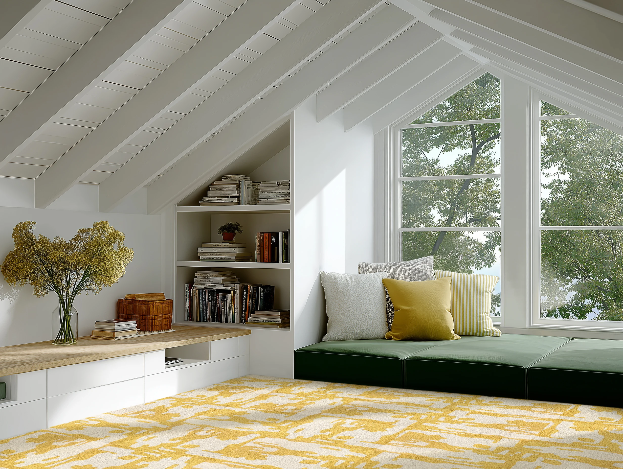 Slanted ceilings, chunky cushions, and tonal shelving make this attic office feel ripe for fresh ideas.