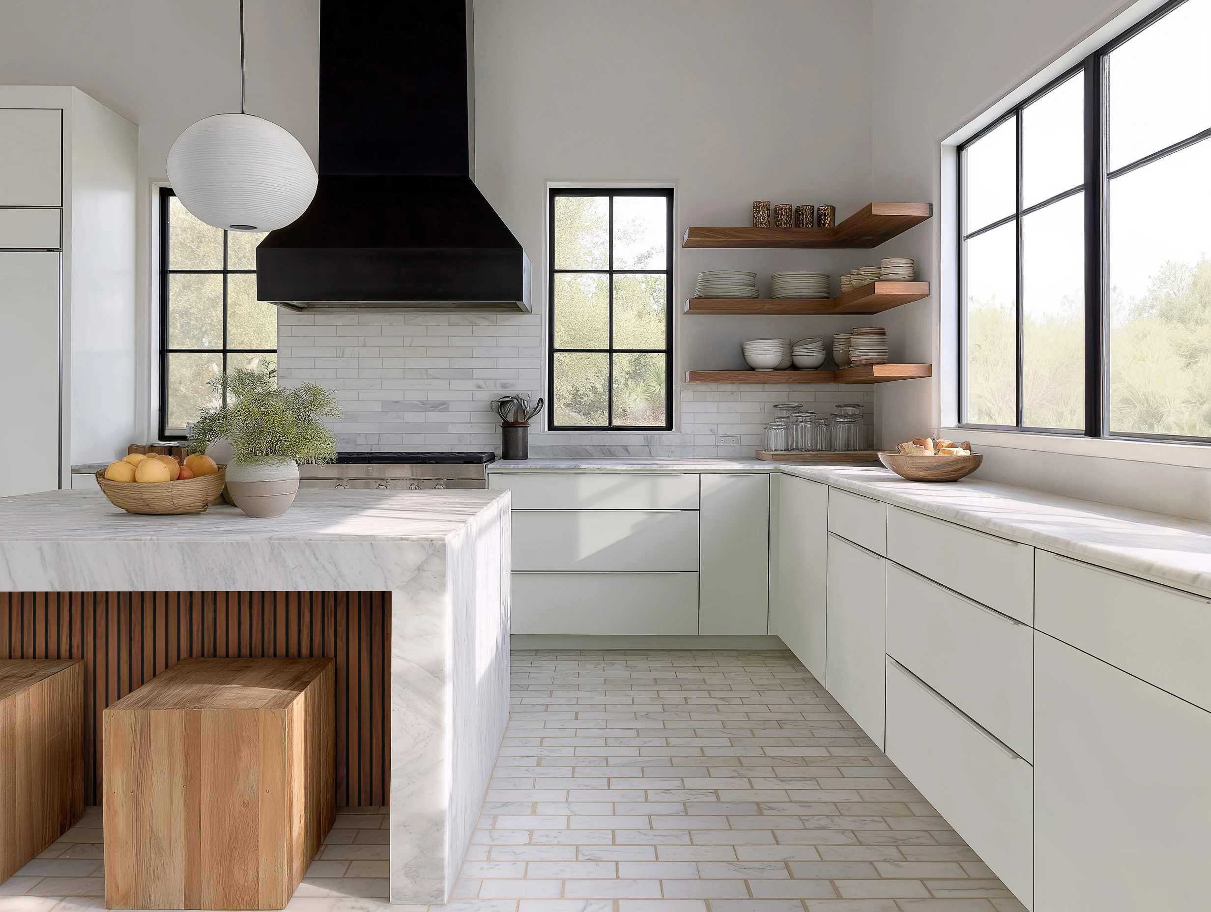 The black hood anchors a light palette of soft whites, warm wood, and stacked brick tile that wraps the kitchen floor and backsplash.