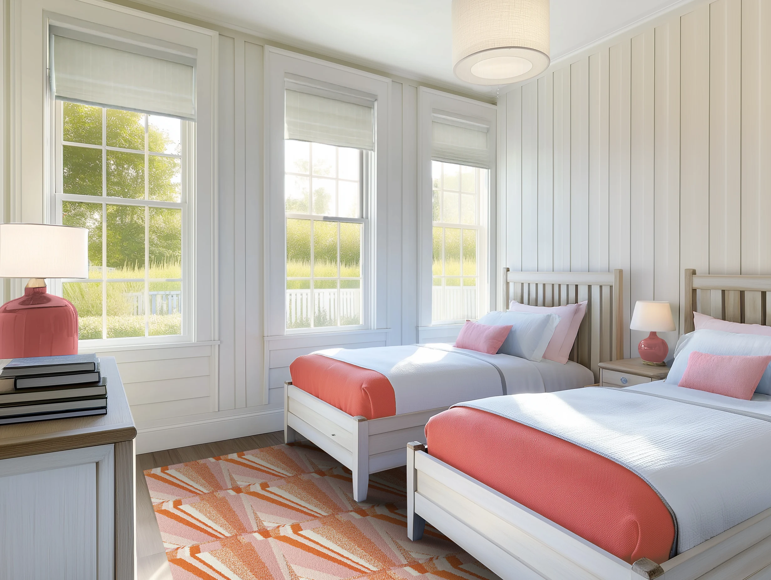 Lighten up your twin bedroom with graphic peach carpet, coral textiles, and light-filtering Roman shades. Sample these materials for a refreshing look.