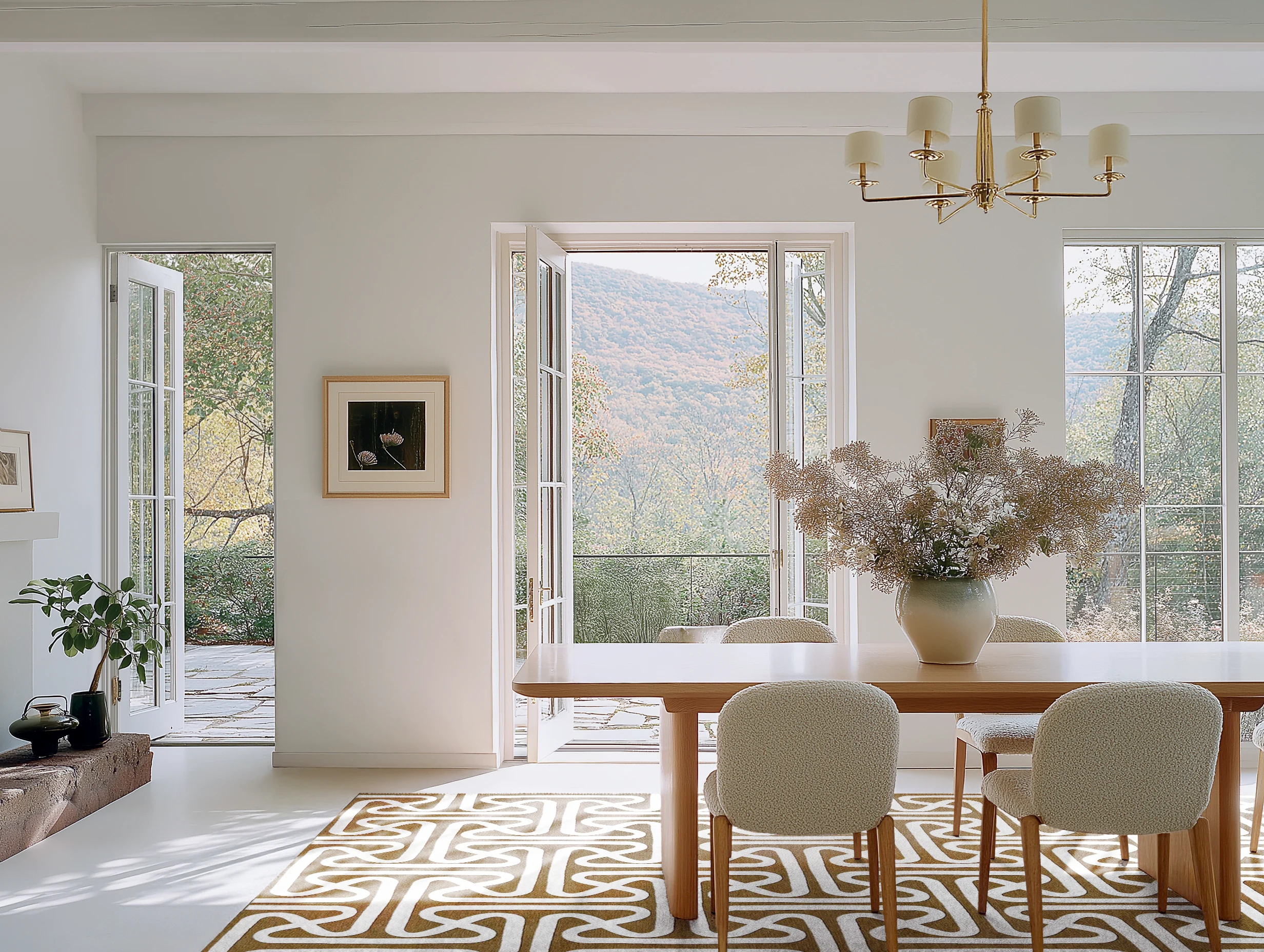 A symmetrical dining setup with sculptural chairs and minimalist walls gets a bold floor moment with a maze-like rug in camel and ivory.