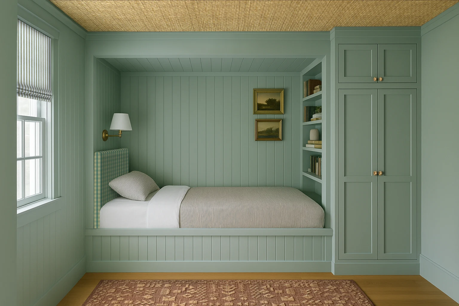 Painted in a soft eucalyptus green, this built-in bed nook blends classic paneling with modern color. A woven ceiling, natural wood flooring, and tonal upholstery complete the tailored, tonal retreat.