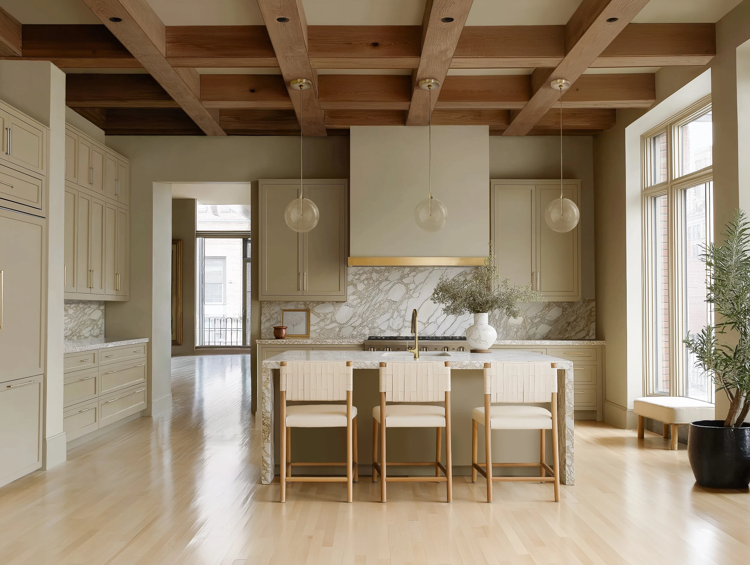 Think about painting your cabinets a new color. Taupe cabinetry shifts the whole mood here, turning a white kitchen into a space with presence and polish.