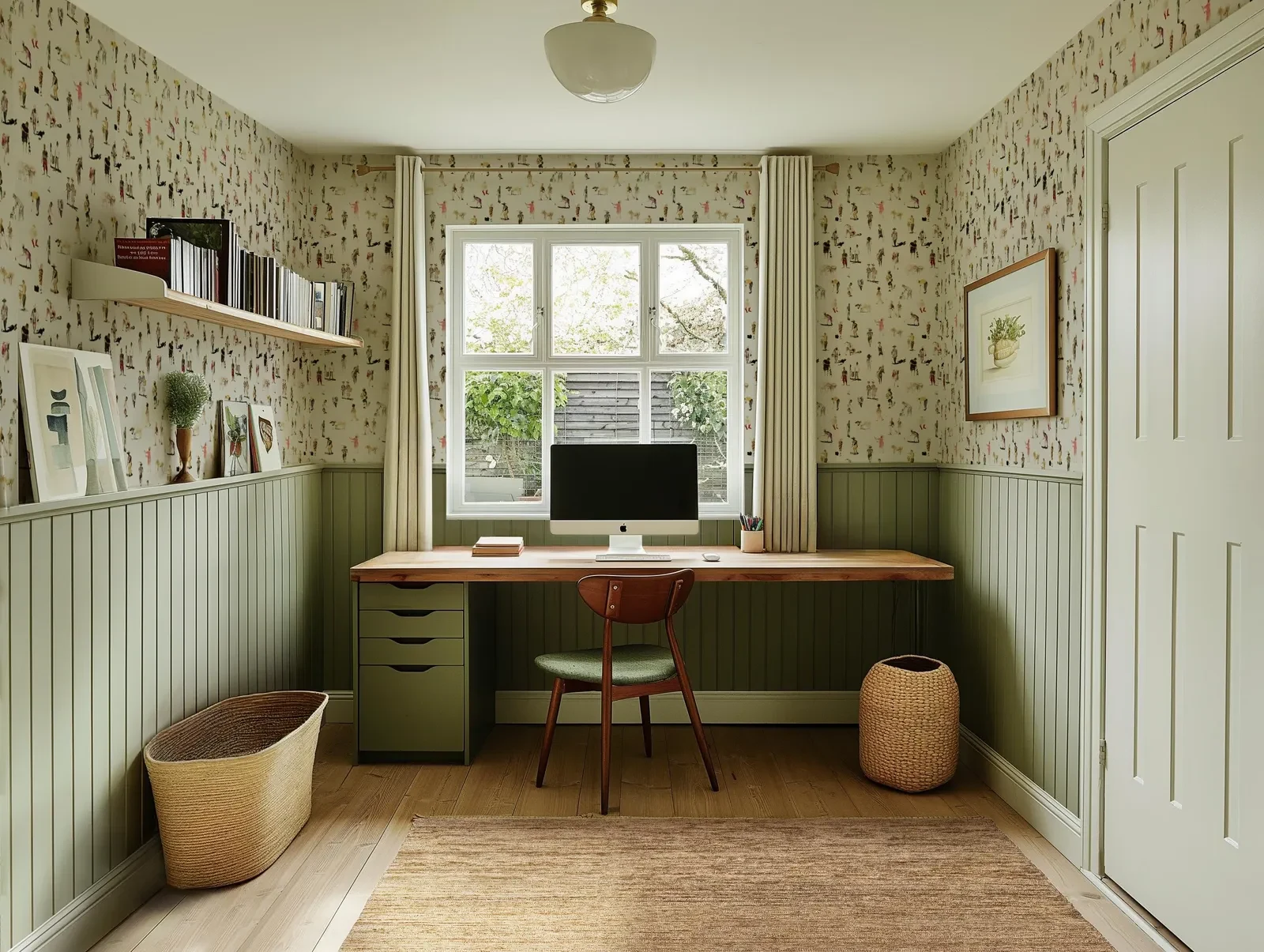 Bring serenity to your workspace with soft green paneling, playful wallpaper, and natural wood finishes. Discover how calming textures create a focused, inviting office.