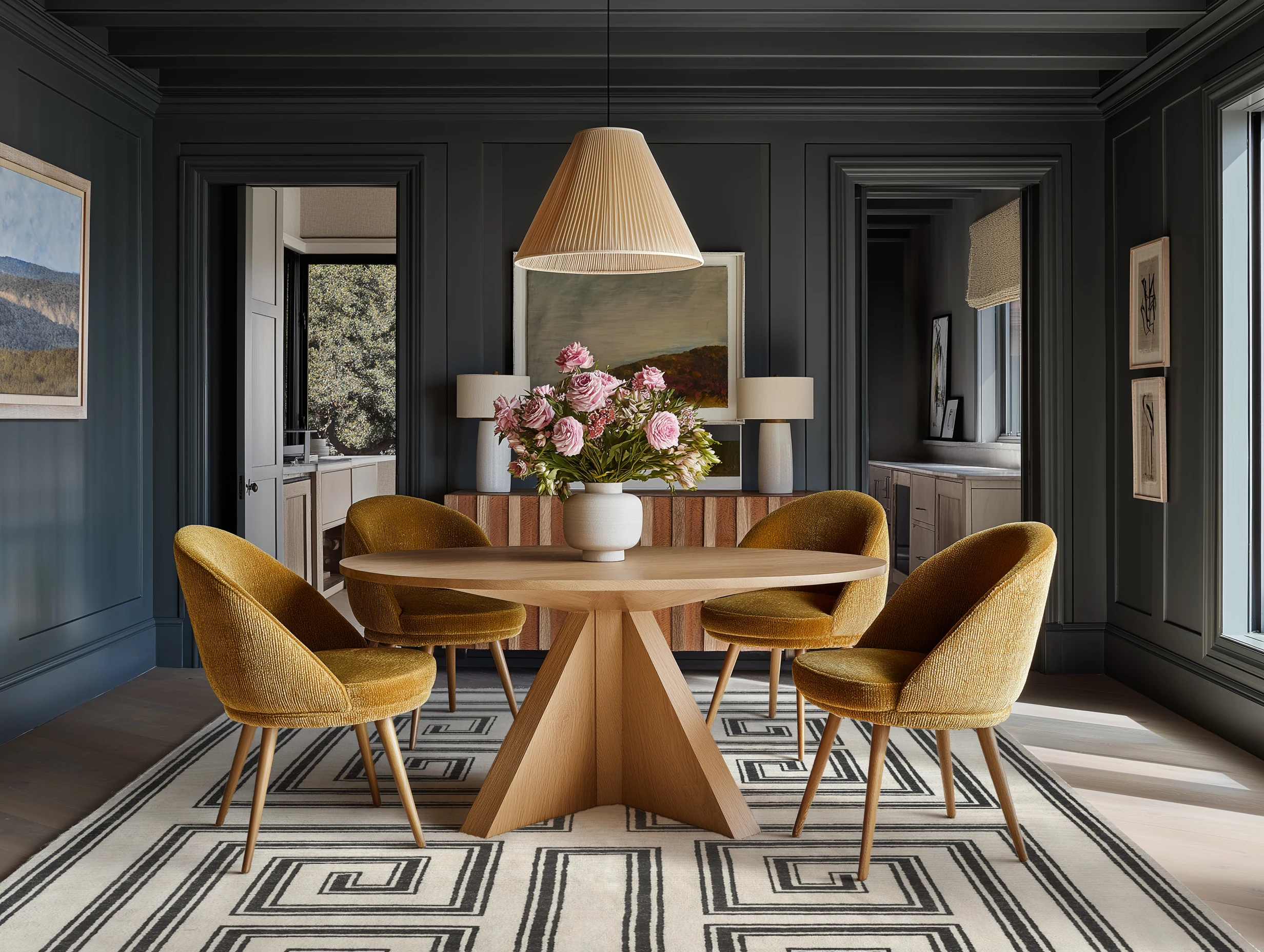 Deep blue paneling and pale herringbone wood floors frame a geometric rug and round pedestal table with gold-toned velvet chairs in this contemporary dining room.