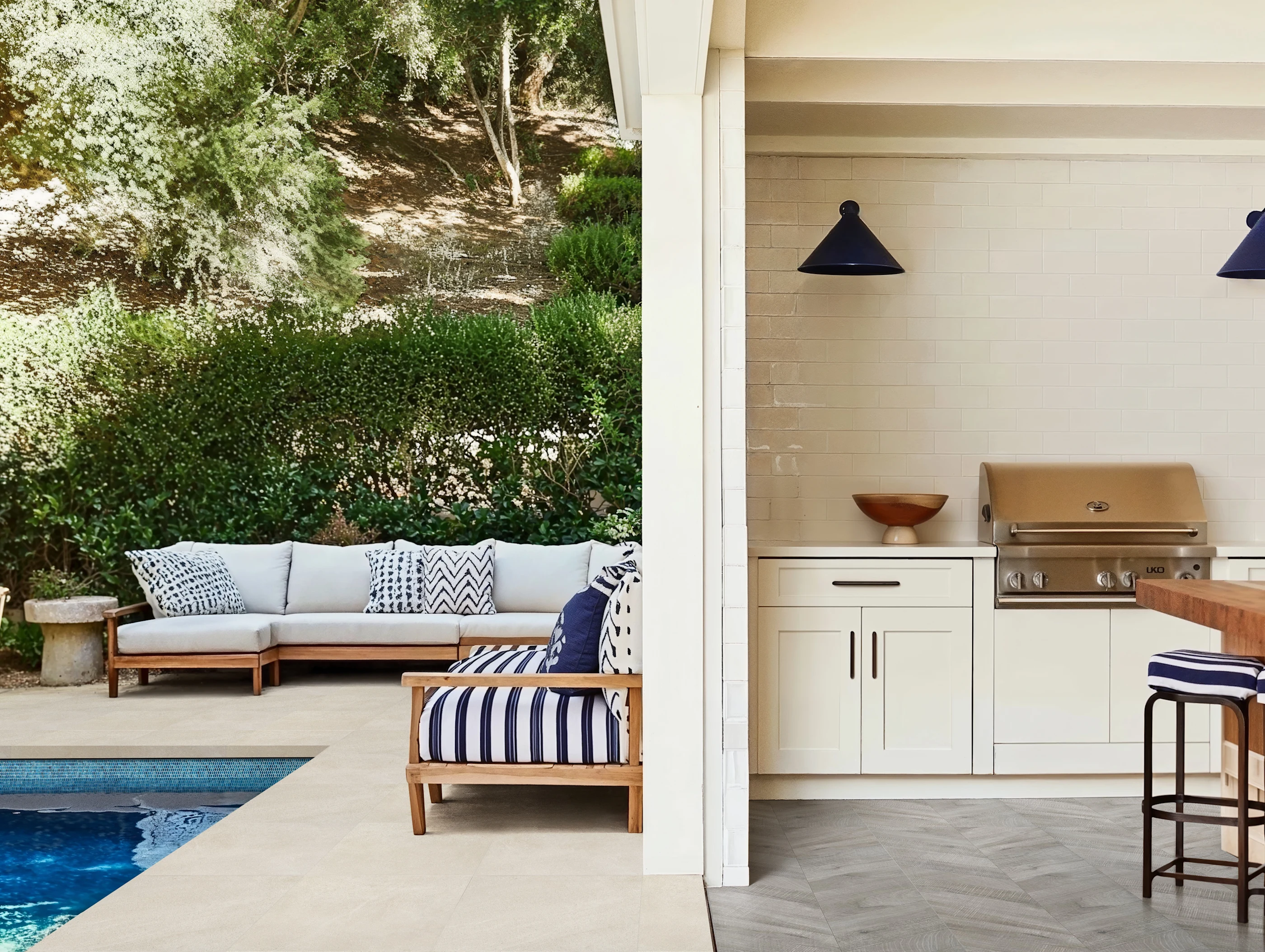 Striped cushions and vibrant pool trim frame the light pavers, while a subway-tiled kitchen backsplash and herringbone floors tie into the overall poolside kitchen setup.