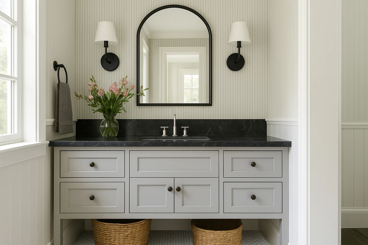 Beadboard paneling wraps the room with crisp white millwork, while a gray vanity with black countertops sits on small-scale mosaic floor tile.