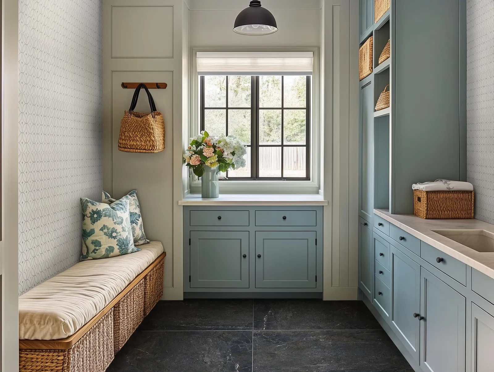 Crisp blue cabinetry, dark slate flooring, and rattan accents bring a beachy charm to this mudroom. Explore how thoughtful design meets practicality in every detail.