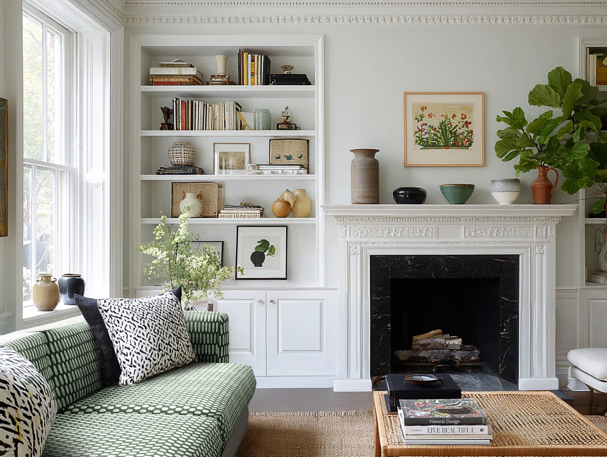 Black marble anchors the fireplace while natural fiber rugs, blocky textiles, and open shelving make the space feel book-smart, not buttoned-up.