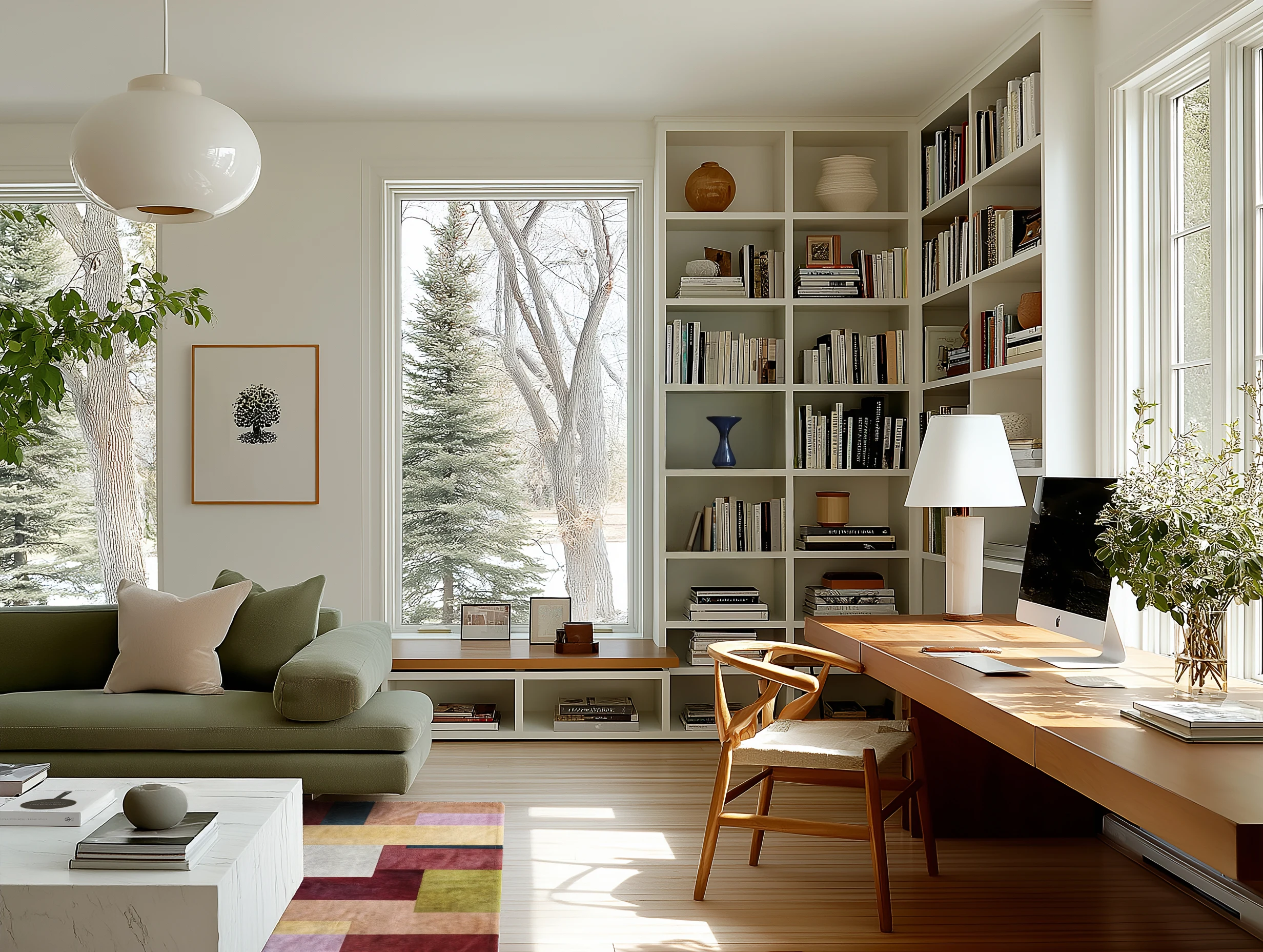 Open shelving and creamy white walls make room for color. A plush green lounge and oversized plant soften the modern lines.