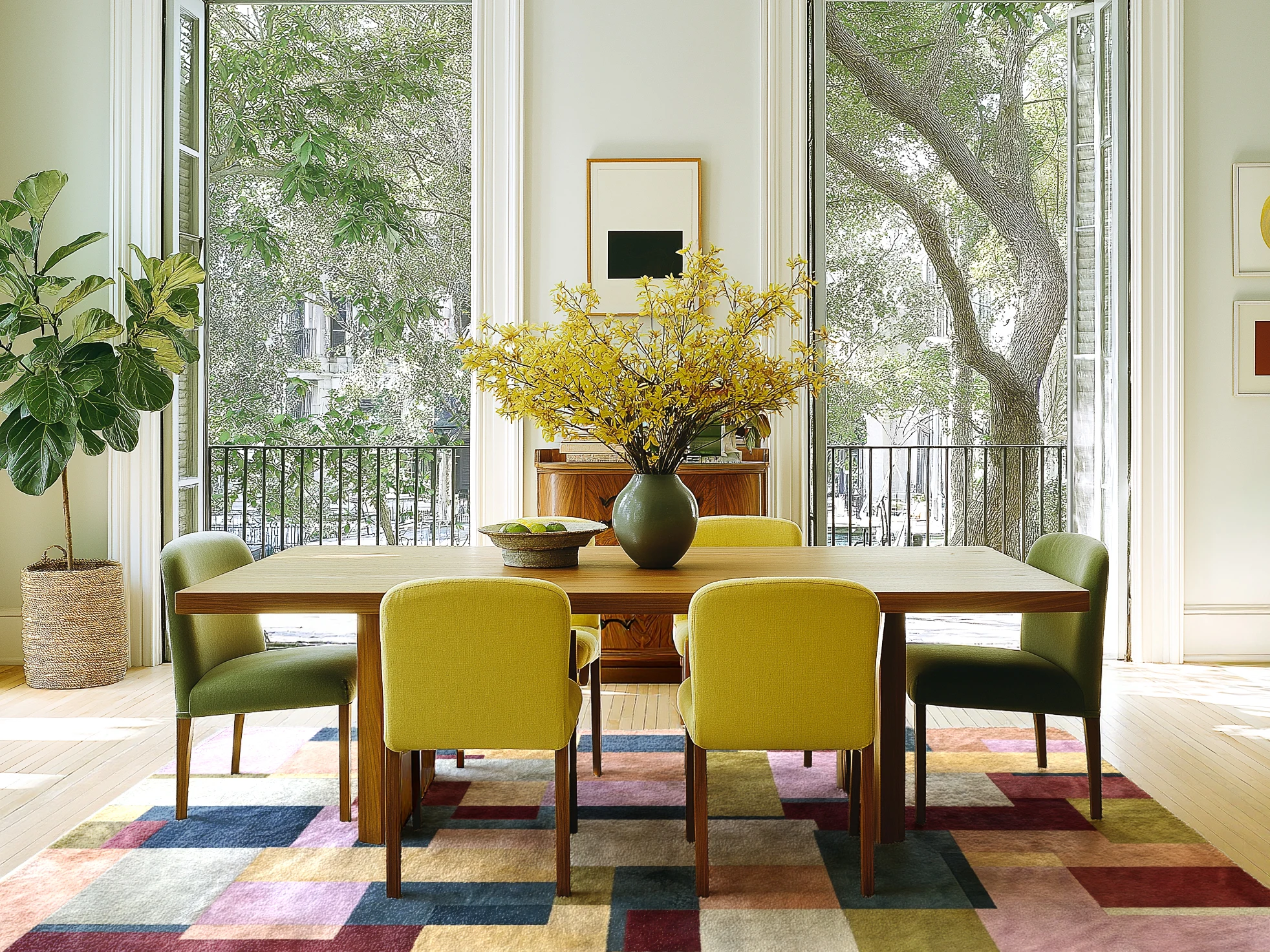 A punchy area rug energizes the blond wood floor, while simple architectural millwork lets the palette lead.