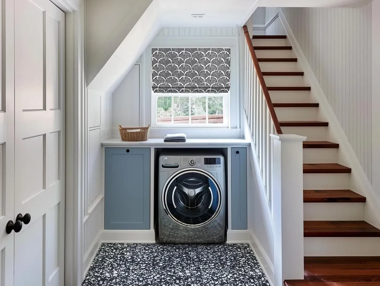 Soft white paint and light blue cabinetry creates a calming space, while bold patterned flooring and a matching Roman shade add visual interest. Explore these materials to maximize style and function in a small laundry area.