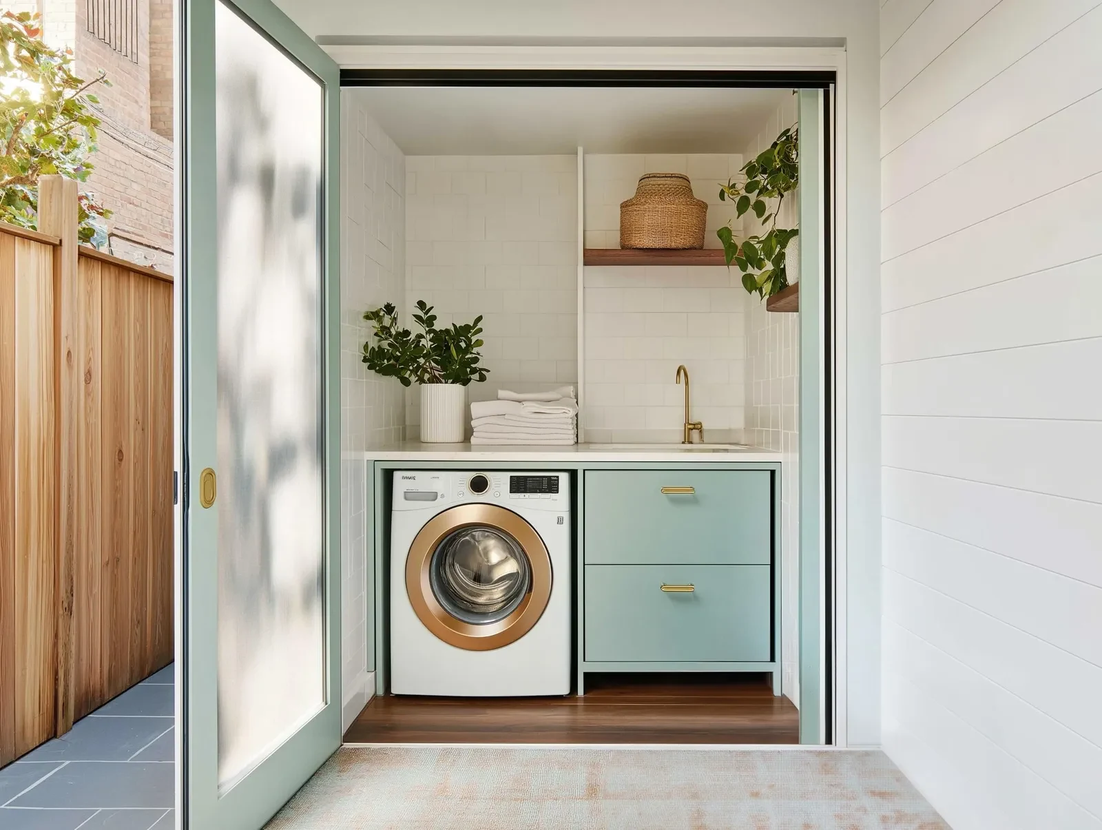 Light wood floors with a natural grain add warmth, contrasting against clean white subway tile walls and mint green cabinetry. Discover these floor and material samples to elevate your laundry space with style.