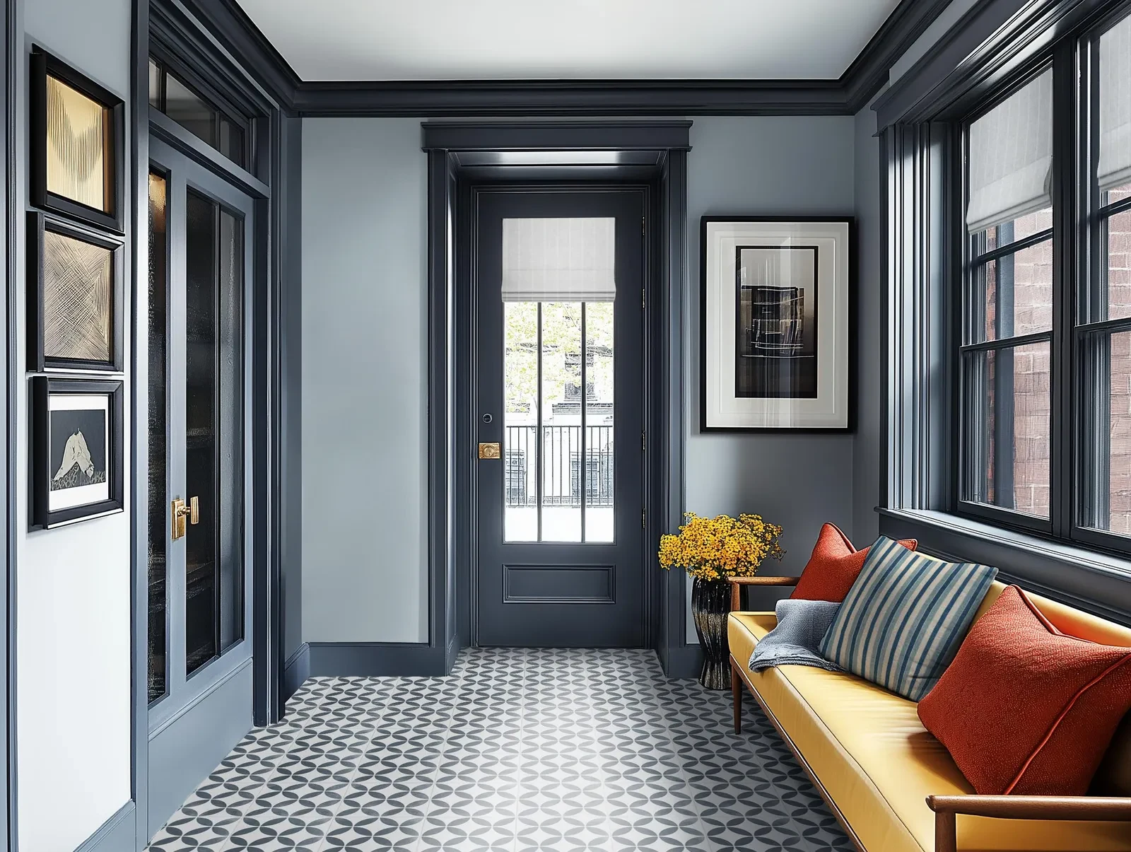 Steel blue paint creates a calm ambiance, complemented by a graphic patterned floor, while bold upholstery in mustard and red hues adds warmth and character.