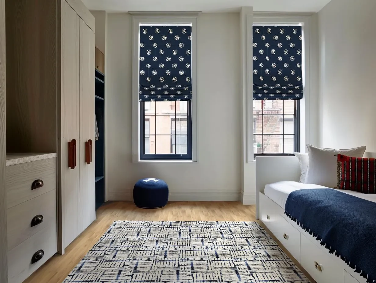 Light wood floors and an abstract rug add a touch of style against neutral walls, while dark blue upholstery and soft accents add comfort. Sample the design.