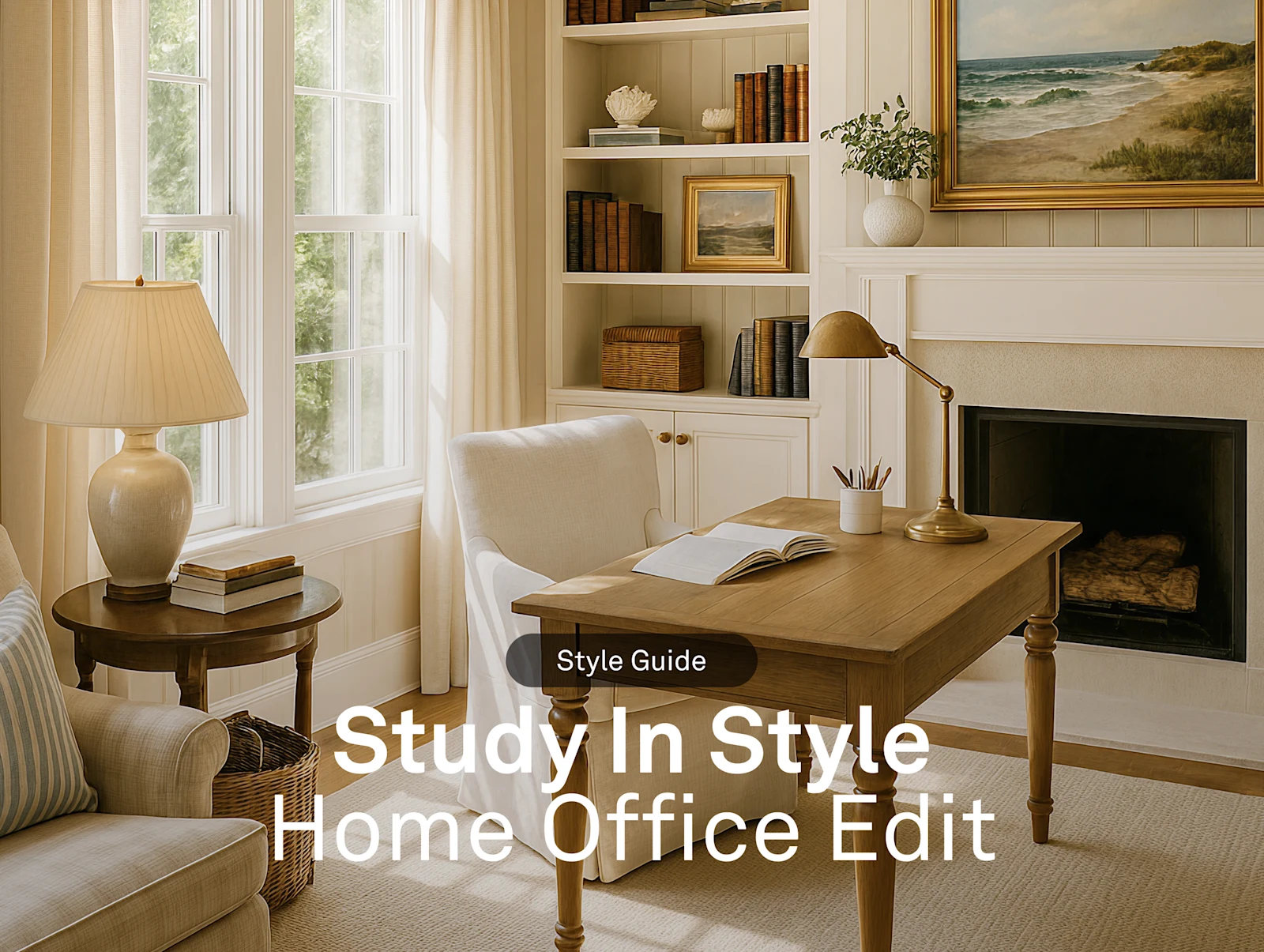 Soft beige wall paneling and a looped wool area rug ground this tailored workspace, while cream linen upholstery adds ease. The result: a light-filled office layered in quiet, textural warmth.