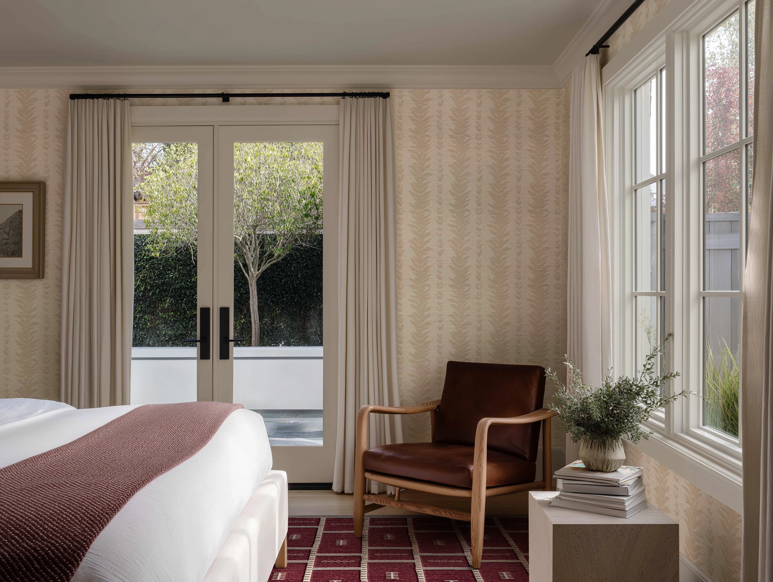 Creamy walls with subtle botanical print pair with warm neutrals and rich red accents. Ivory curtains, natural textures, and tailored trim strike a soft, transitional tone.
