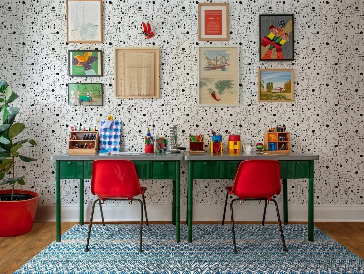 Ignite inspiration with bold colors, playful wallpaper, and vibrant decor. Explore how lively patterns and textures turn a workspace into an imaginative haven.