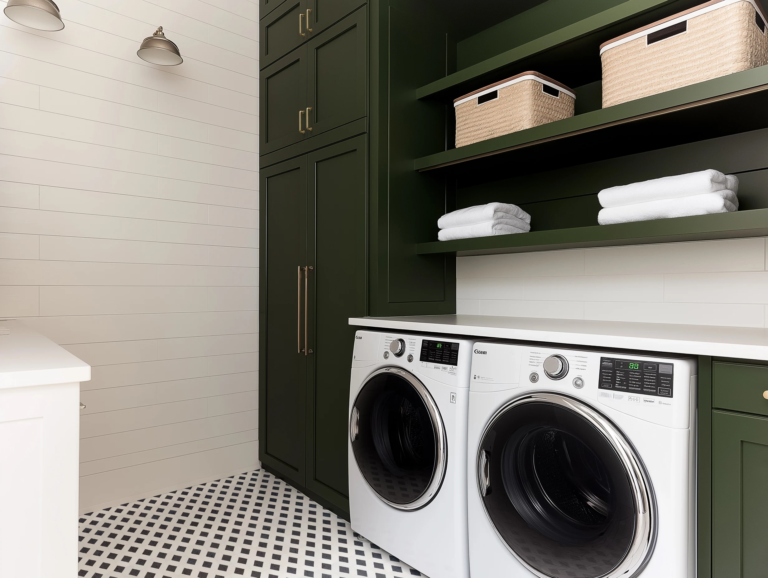 Deep green cabinetry contrasts with white shiplap walls and crisp countertops, while a bold patterned tile floor brings added style and visual interest. Discover the materials and get the look.