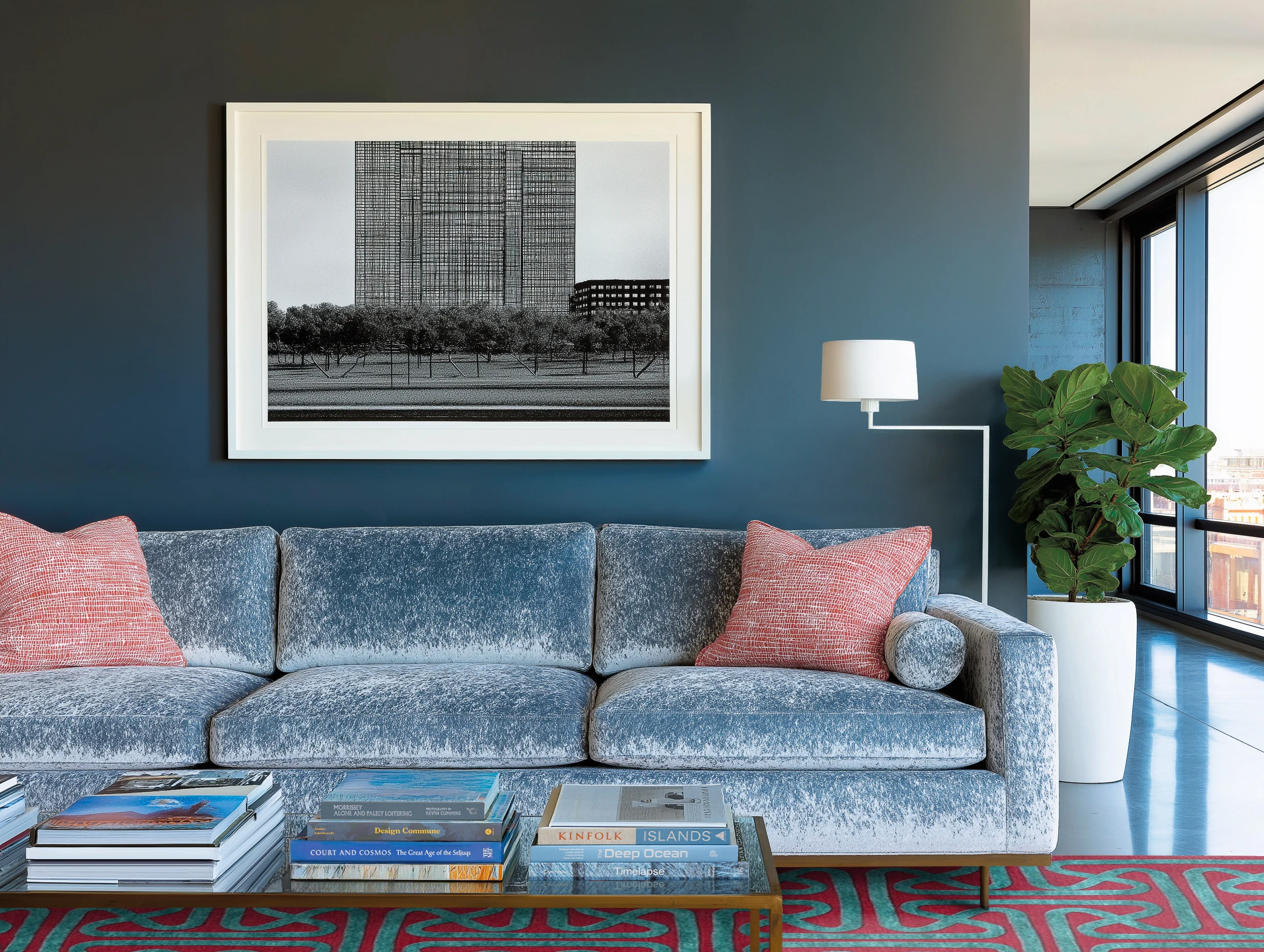 A plush velvet sofa and graphic flatweave rug stand out against the dark-painted wall and polished concrete flooring in this open-plan living space.