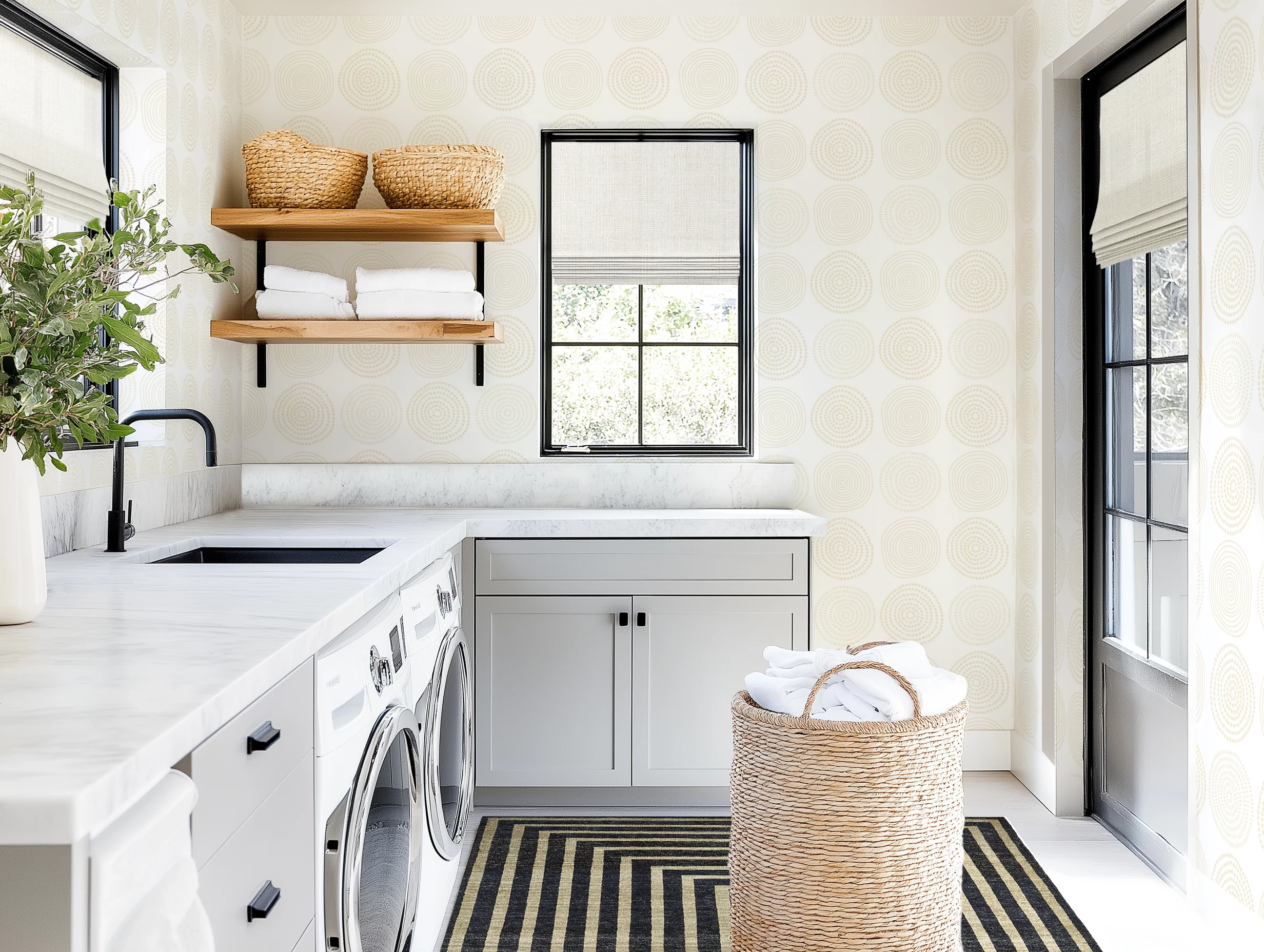 Crisp white marble countertops, light gray cabinetry, black painted accents and Roman shades provide a modern aesthetic in this laundry room. Sample the design elements to elevate your space.
