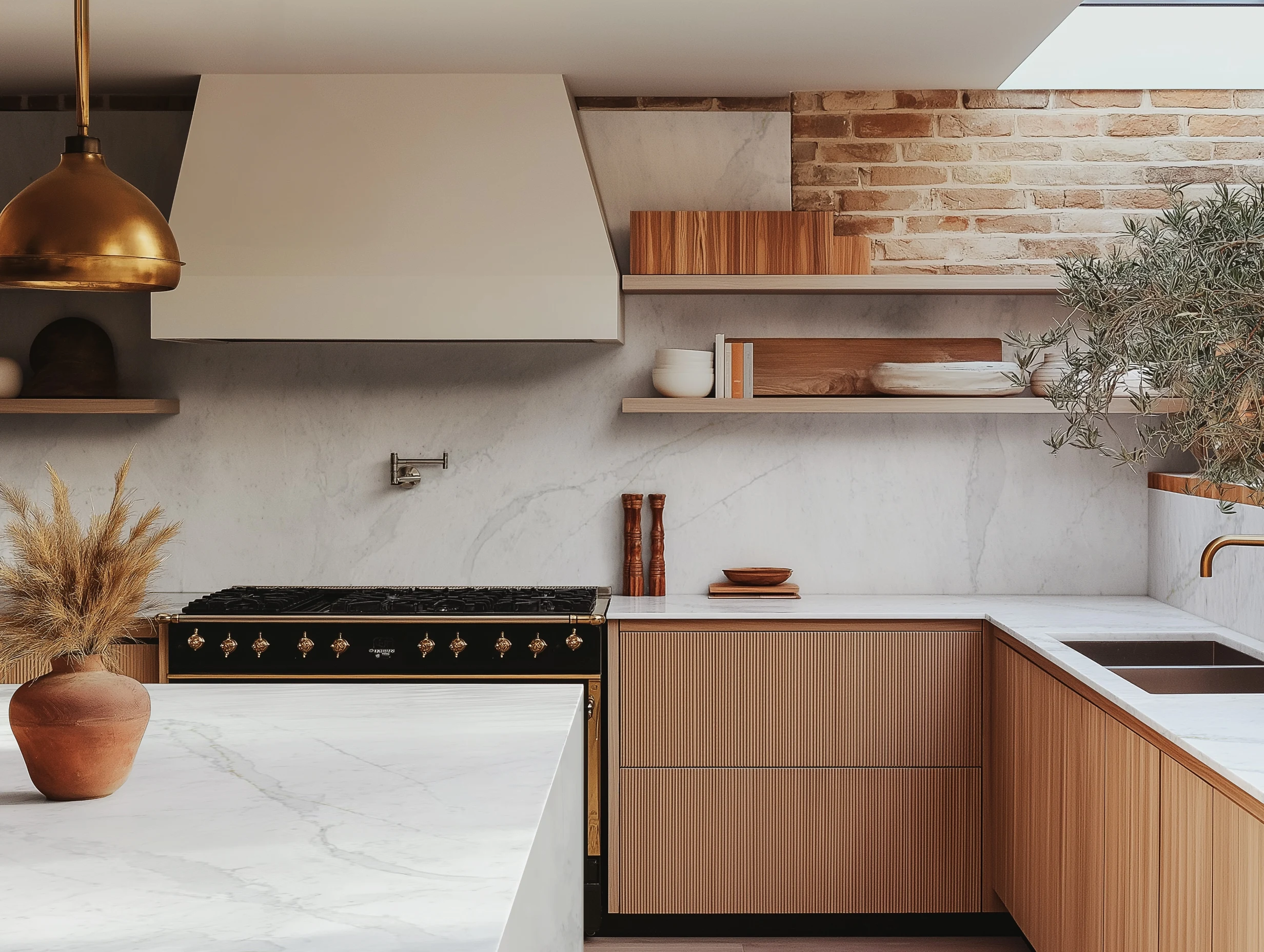 Experience the refined beauty of natural stone and warm wood textures. Discover how earthy materials and sleek design create a kitchen with timeless character.