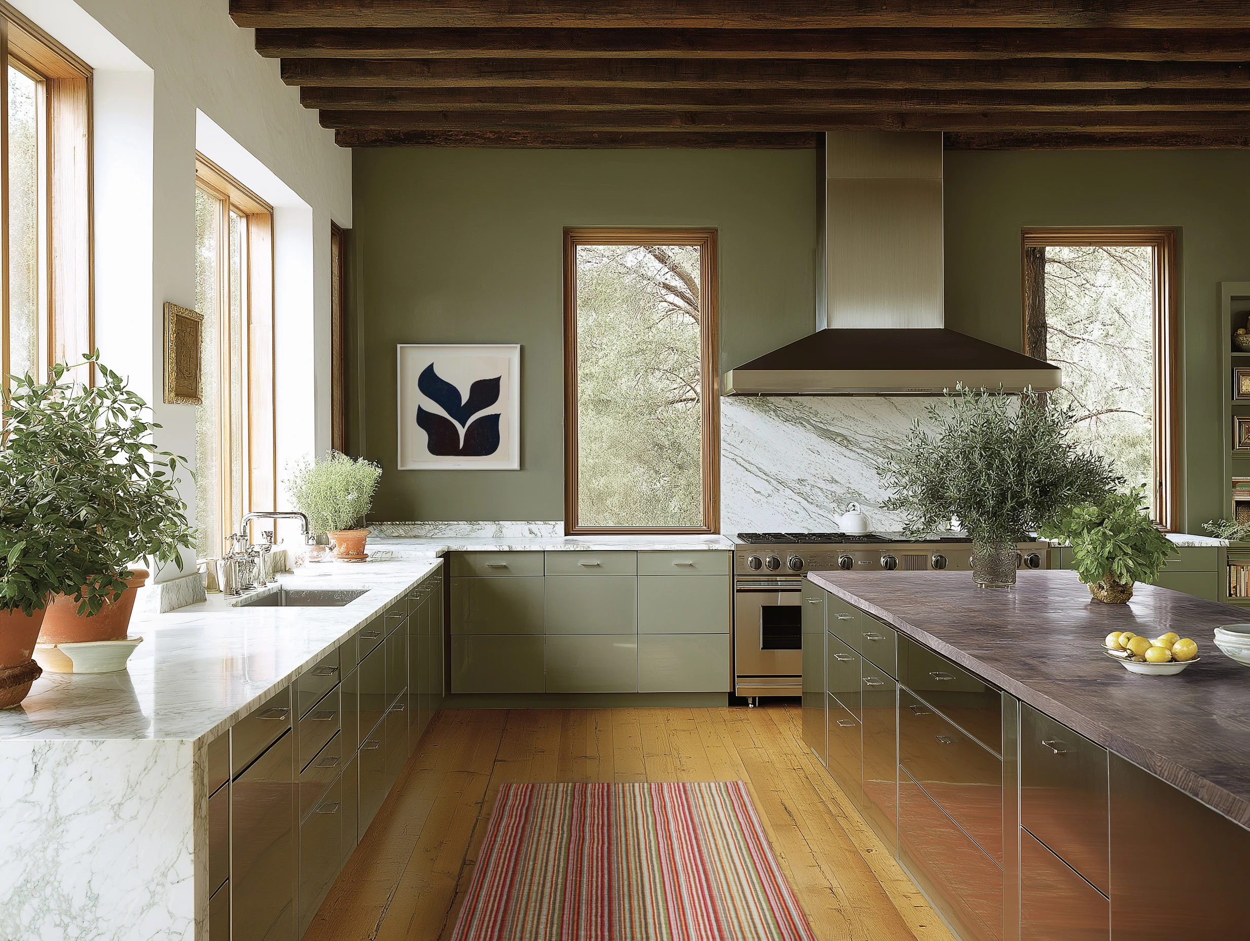 Olive lacquer meets natural oak floors and a veined marble moment. A moody walnut island keeps the palette grounded and the countertop styling clean.