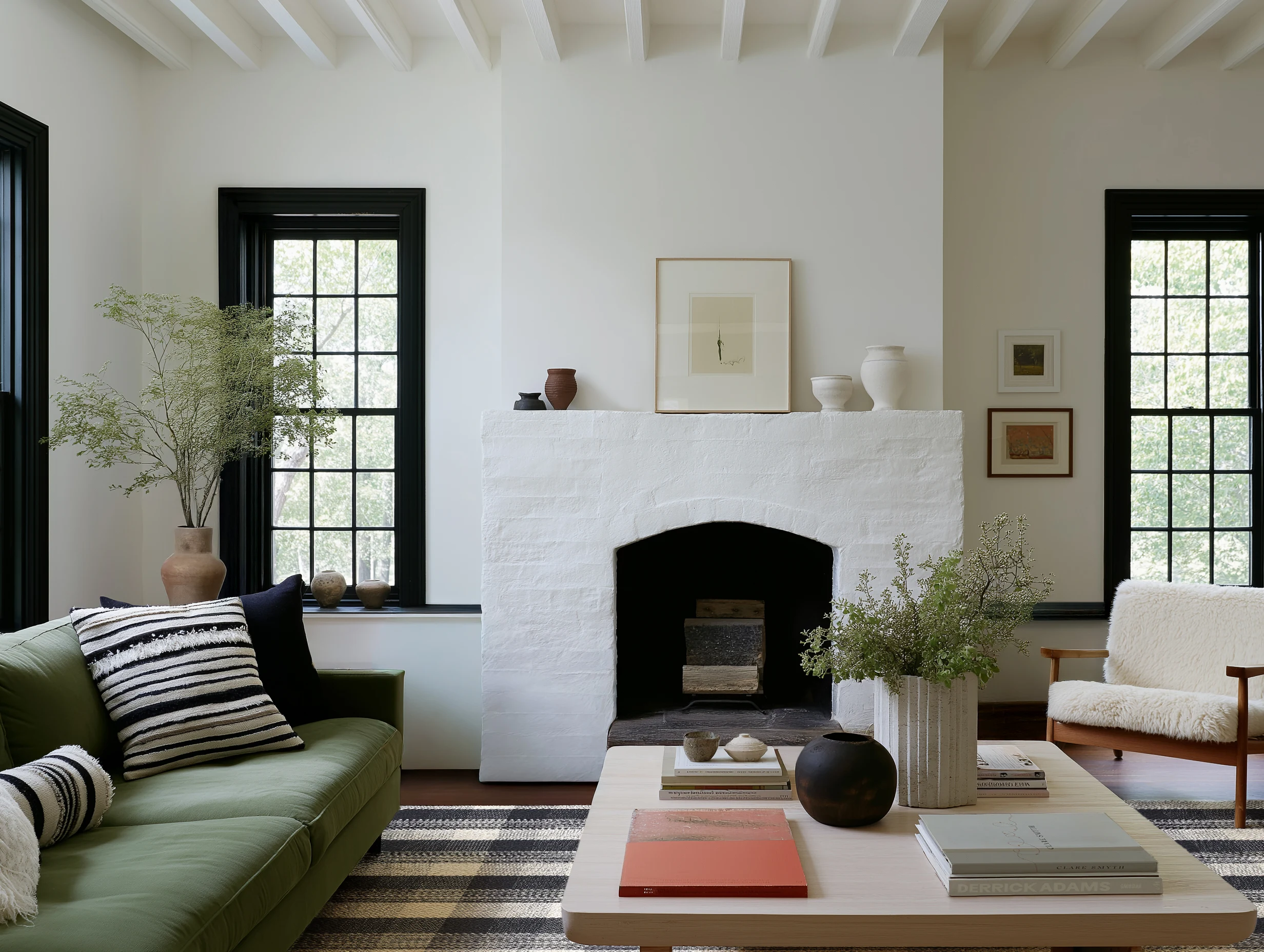 Whitewashed plaster meets black-framed windows and beams. Striped rugs and pale oak tables pull tonal texture across a classic fireplace-centered layout.