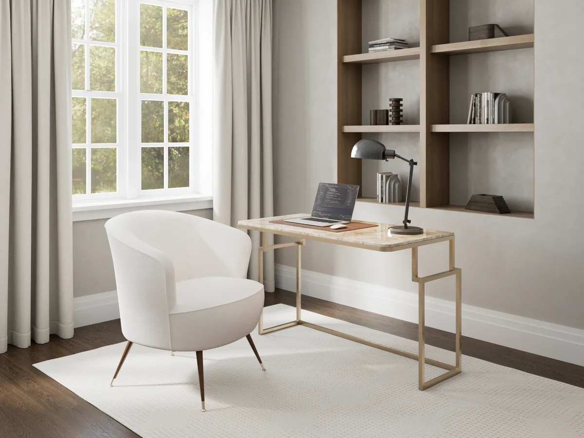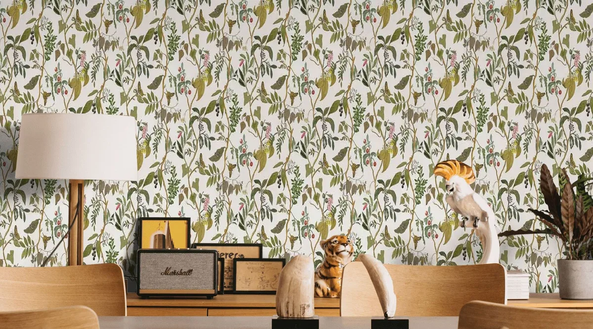 Delicate floral wallpaper paired with crisp white wainscoting brings timeless charm to this foyer. A deep navy door and soft pink cushions on a chic bench add a contemporary twist.