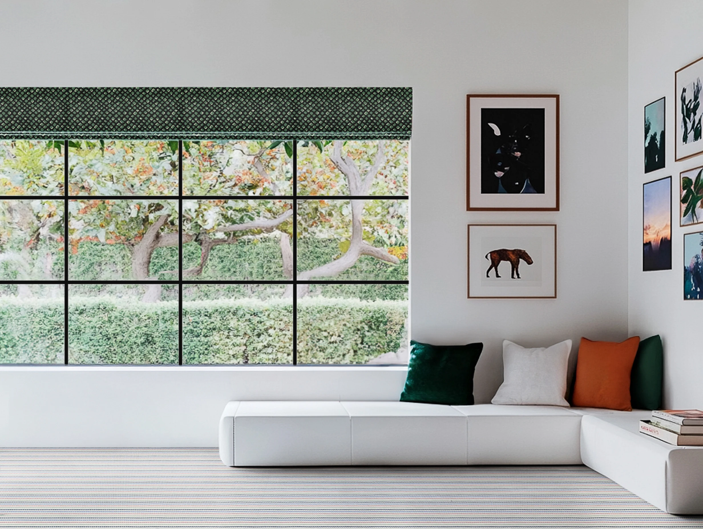 A striped rug and minimalist upholstery contrasts with the bold wall art and patterned Roman shades in this art-focused play space.