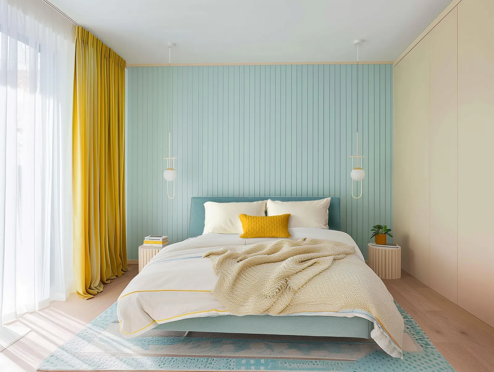 Revitalize your bedroom with soft aqua walls and rug, light wood floors, and vibrant yellow drapery. Sample these materials to capture the airy atmosphere.