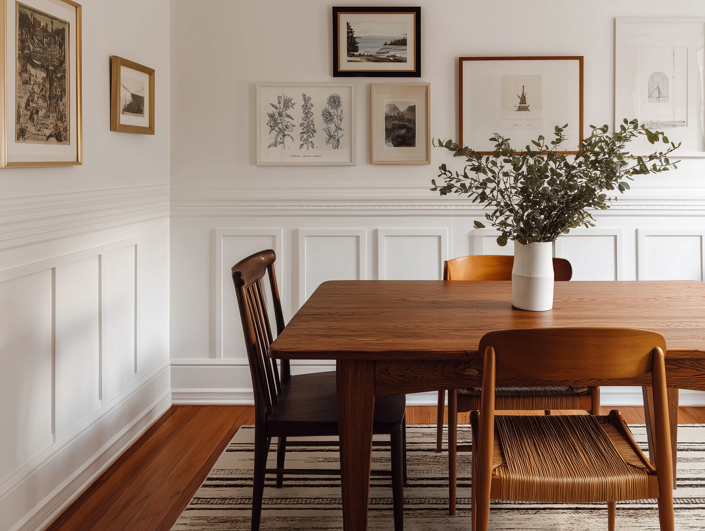 A gallery wall above crisp wainscoting complements warm wood floors and a textured area rug, anchoring the dining room design.