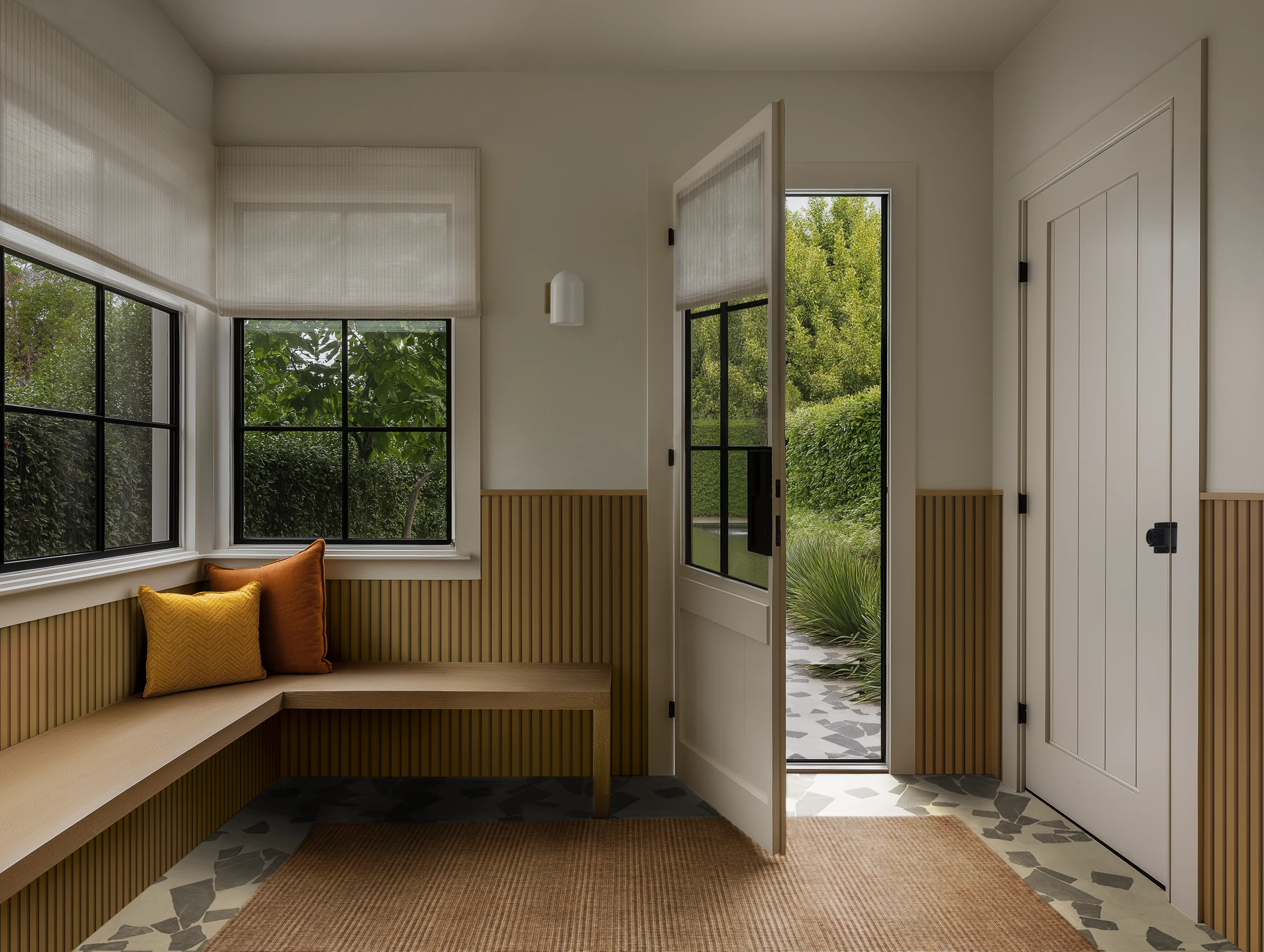 Oak slat paneling and terrazzo-look tile ground this bright, durable mudroom. Soft pillows and clean lines make it both family-friendly and timeless. Blend warmth and function in an entry that works for everyday life.