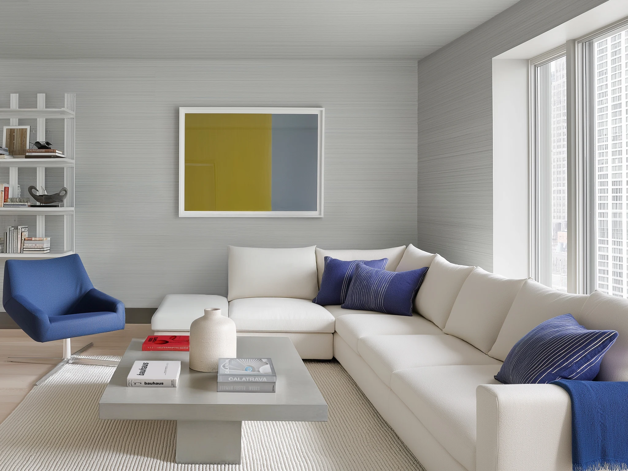 Grasscloth wallpaper and white oak floors set the stage for a bold blue chair and print to steal the show—no apologies.