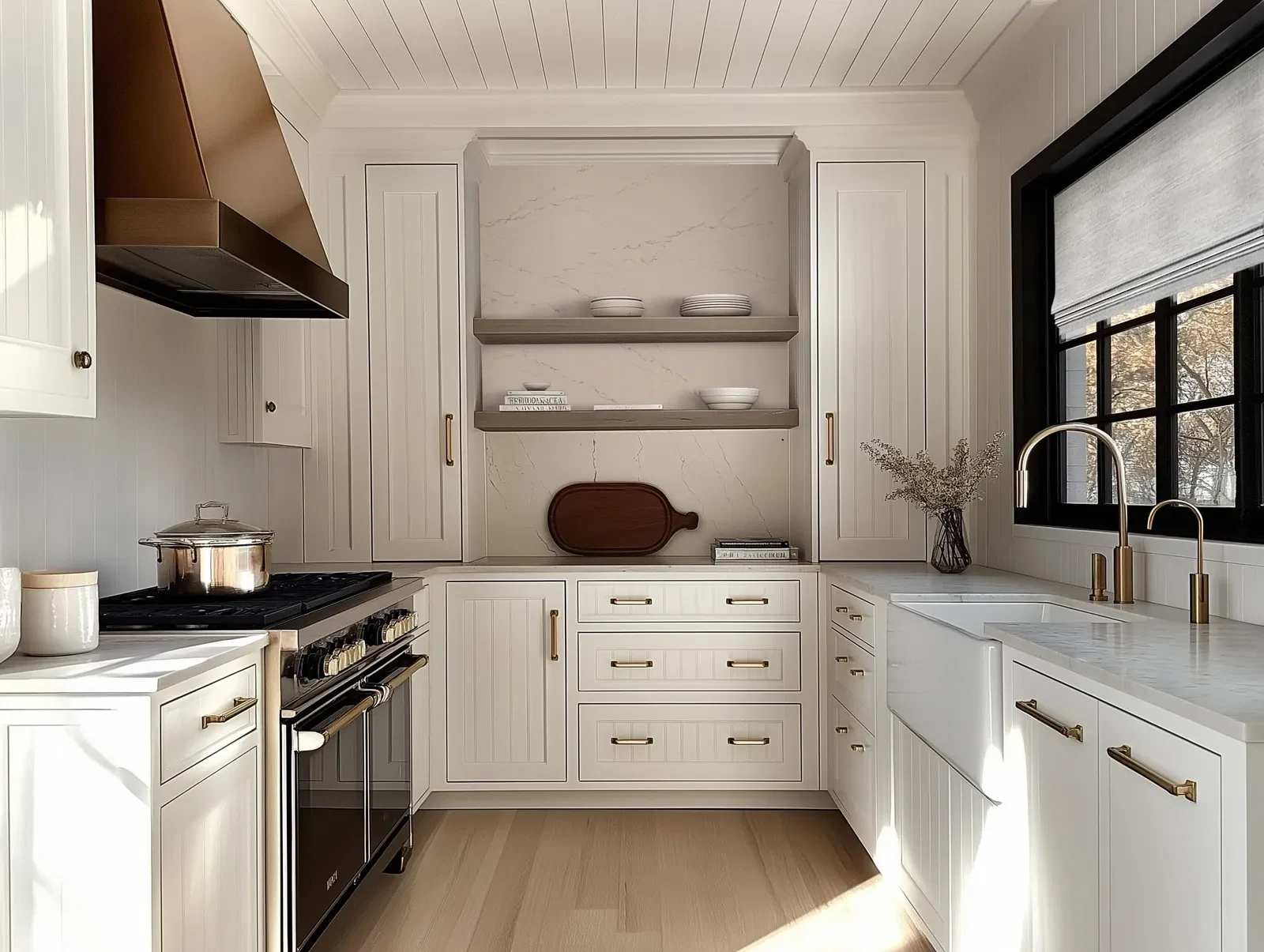 Elevate your kitchen with timeless white cabinetry, warm brass accents, and sleek marble surfaces. Explore the materials to create this refined and inviting space.