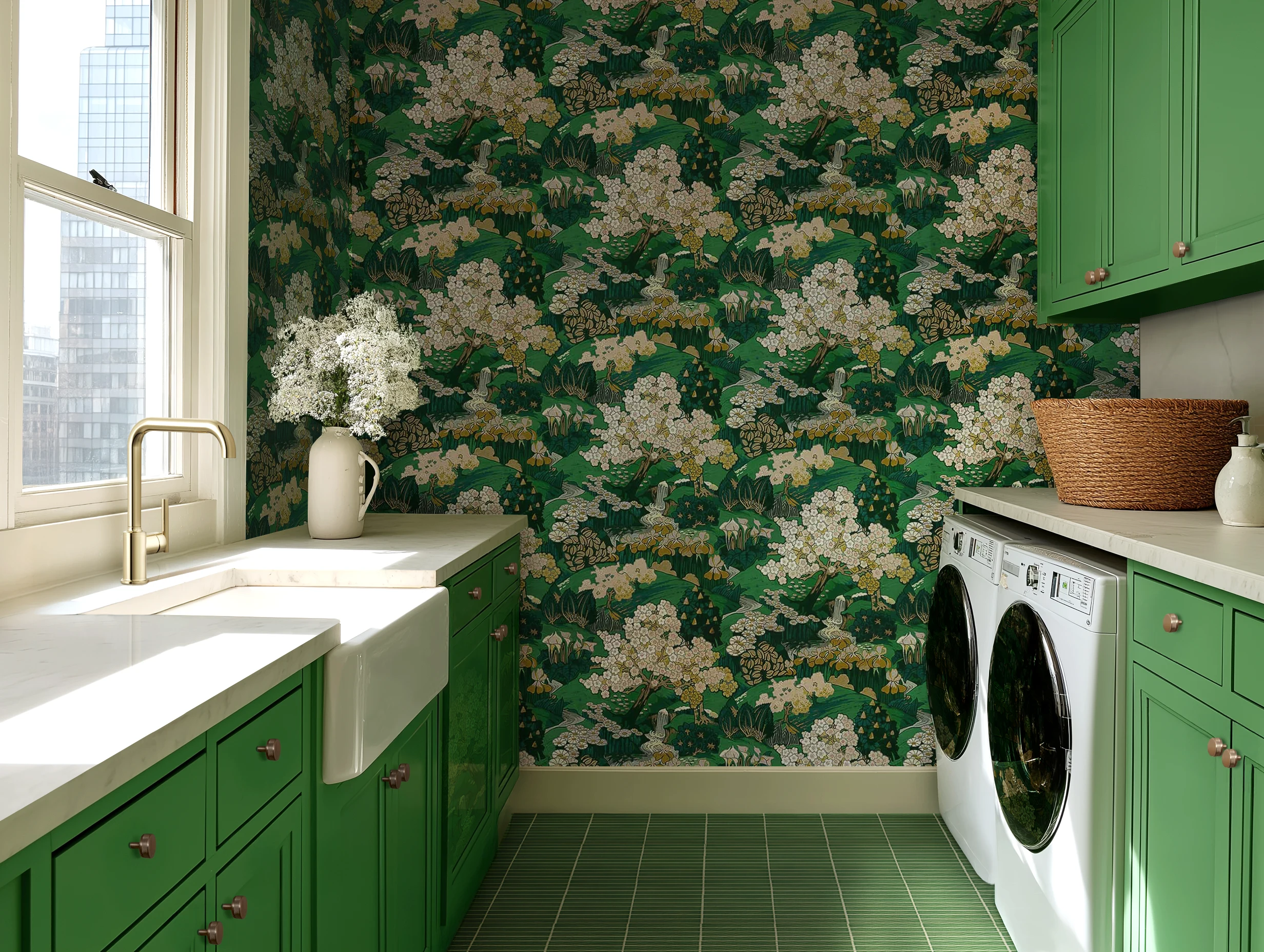 A jewel-toned palette of glossy emerald cabinetry and vintage floral wallpaper transforms this laundry room into a layered, expressive space. Rich green tones meet botanical patterning for a look that’s bold, functional, and rooted in modern heritage style.