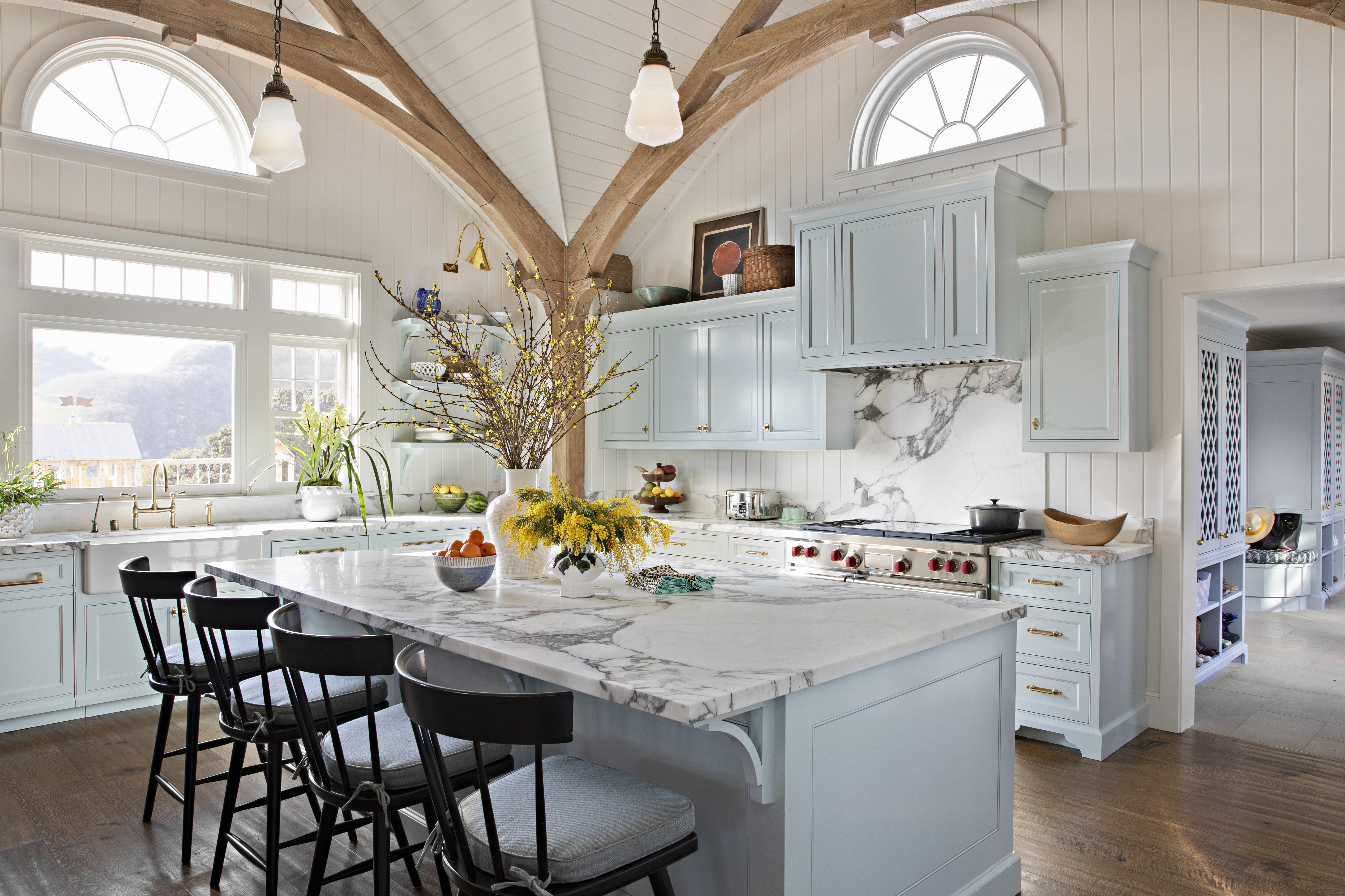 It all depends on the kitchen and the style of the home—but generally, less is more. When selecting a material, consider how the finish will work with other natural textures in the space—something like honed stone or soft veining pairs beautifully with wood or woven accents. And, keep the surface clean with just a few beautiful, functional pieces like a ceramic bowl, a great cutting board, or a favorite pitcher to add charm without clutter.