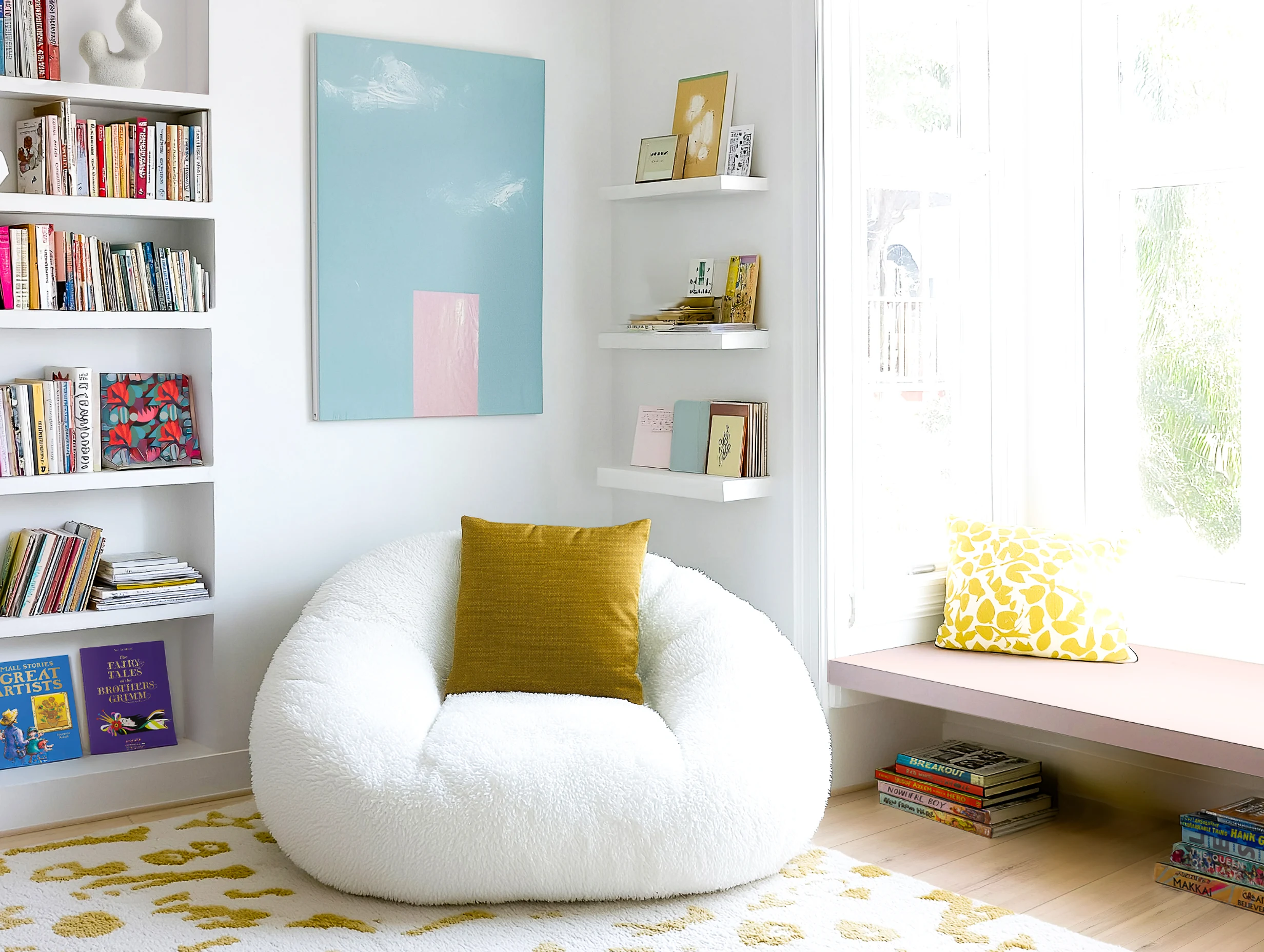 Create a spot for reading, homework, and lounging. Neutral walls and furniture let colorful pillows, books, and a painted pink window seat add playful energy.