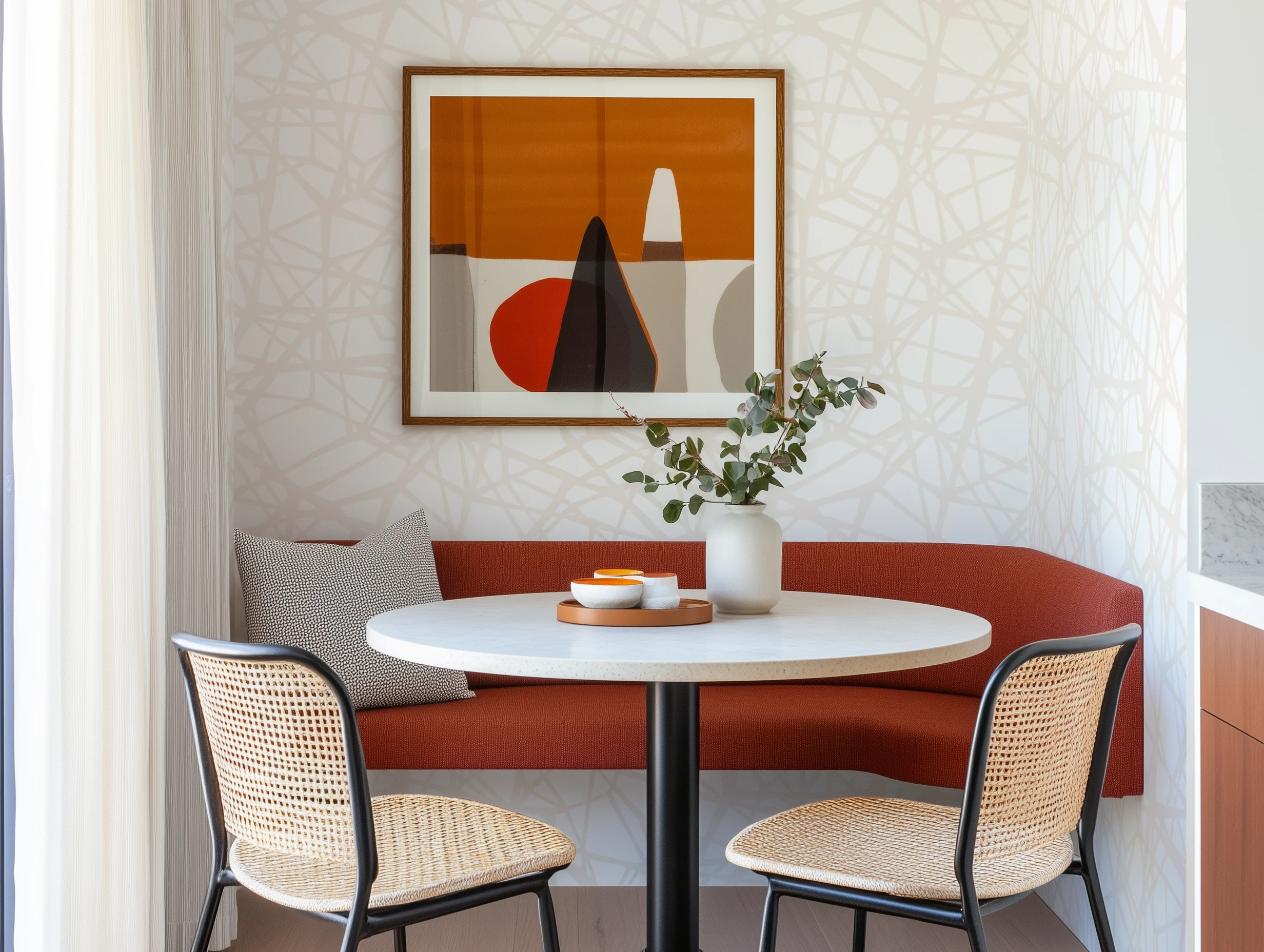 Natural drapery and pale wood floors contrast with the red upholstery and graphic print, giving the built-in nook a clean but high-impact look.