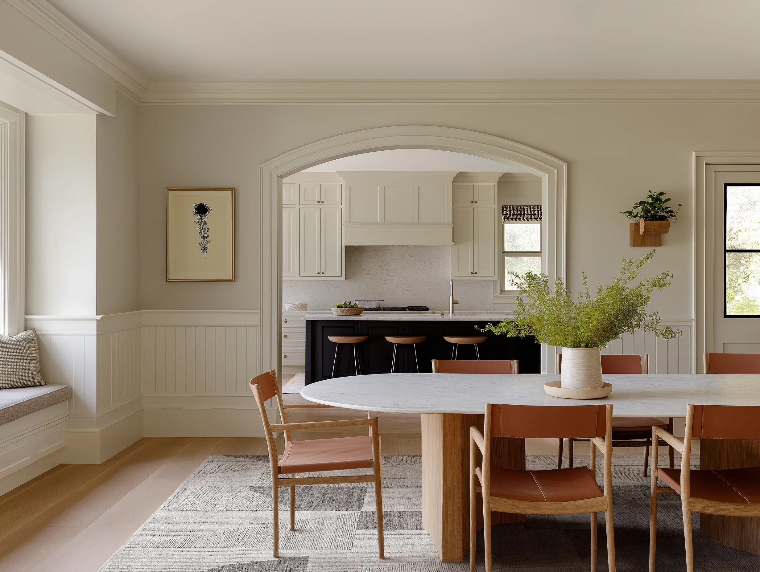 Light oak flooring pairs with a pale area rug and caramel-toned leather chairs, adding layered warmth and texture to this neutral dining space.