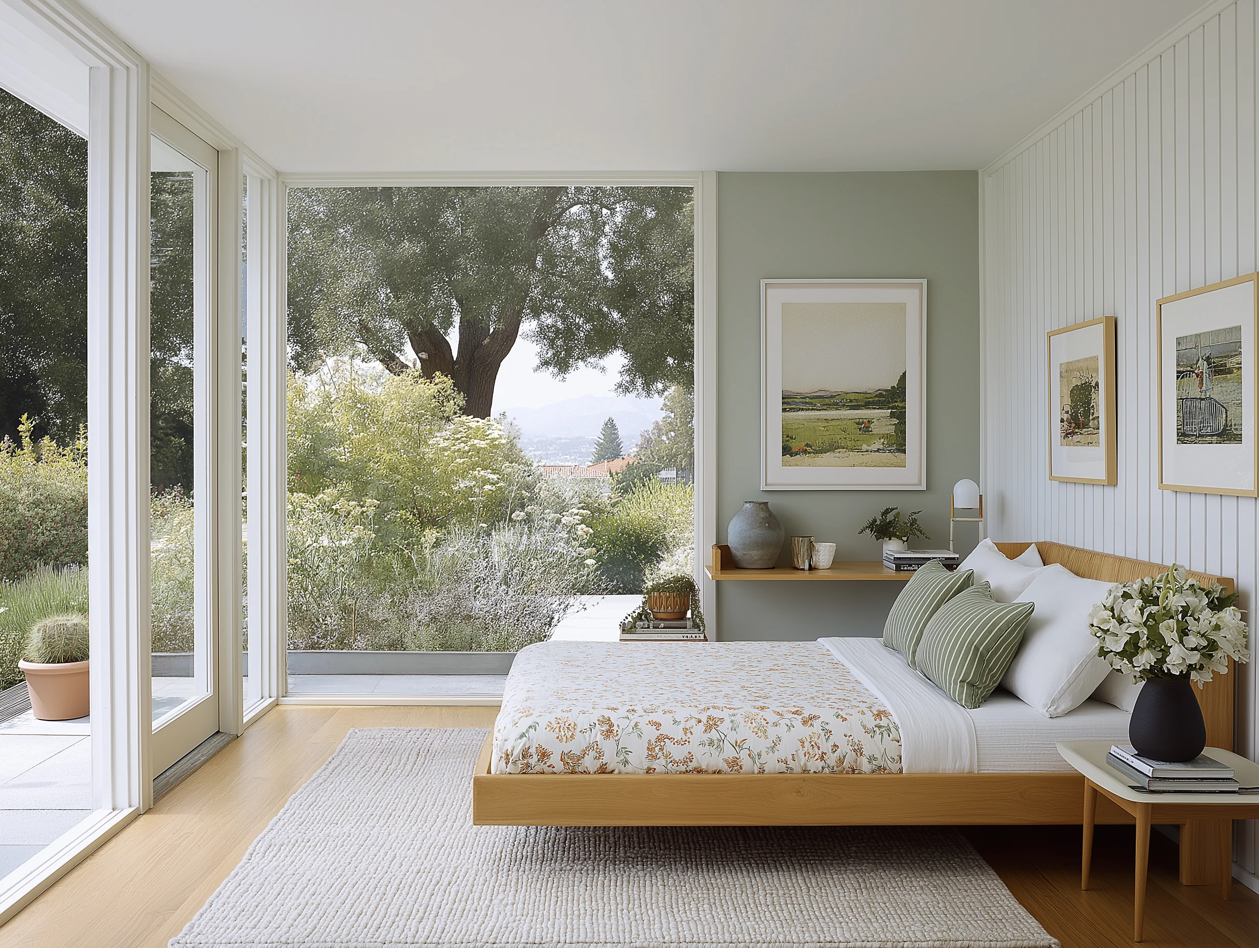 Natural oak, mossy green textiles, and sunlight-soaked walls make for a gentle modern retreat.