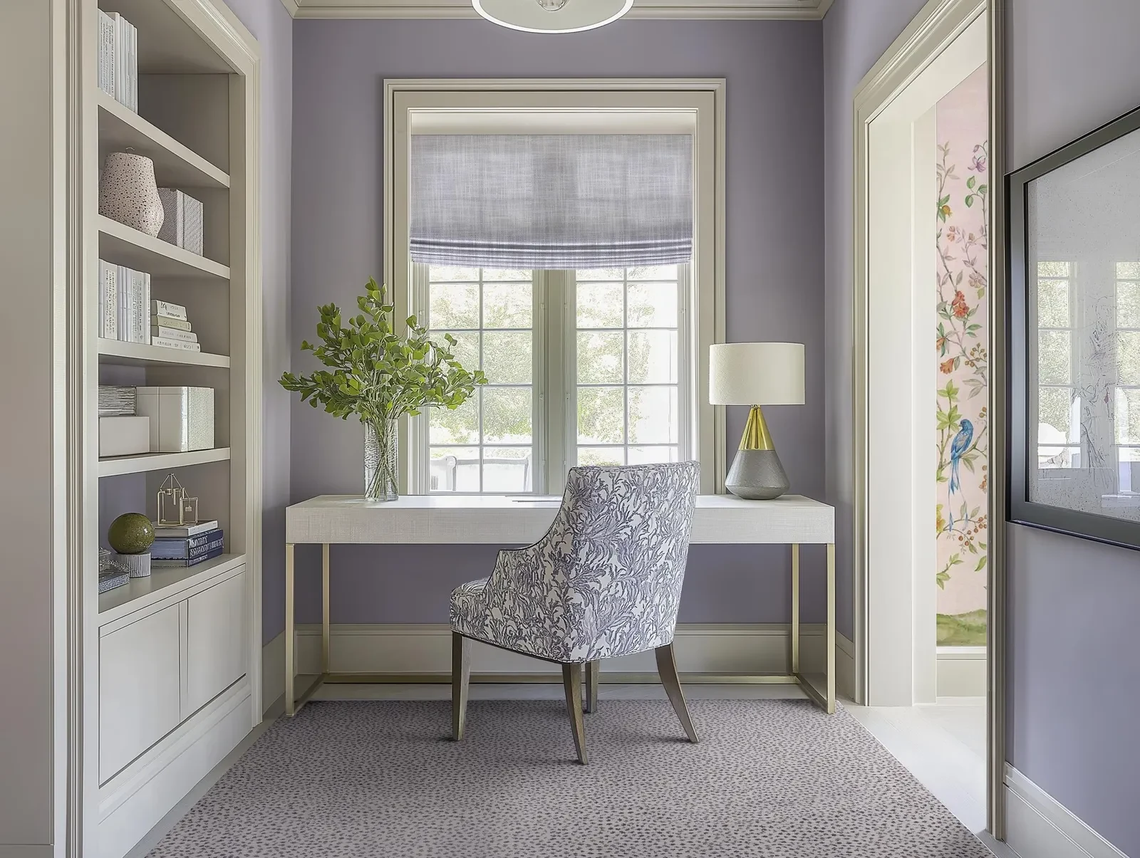 Indulge in a soft lilac-colored home office with soft painted walls, matching window shades and a chic rug. Discover the materials to create your own beautiful workspace.