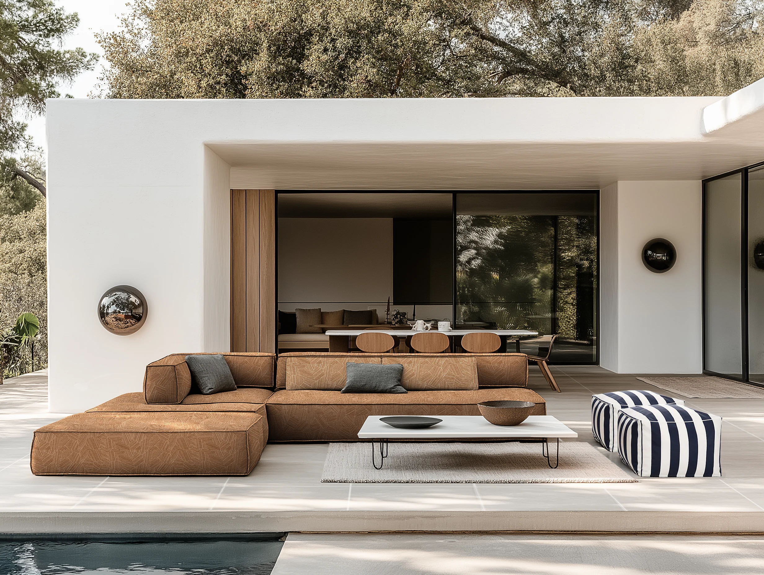 Minimal lines meet soft edges with outdoor furniture set on large grid tile and anchored by a simple neutral rug beside the pool.