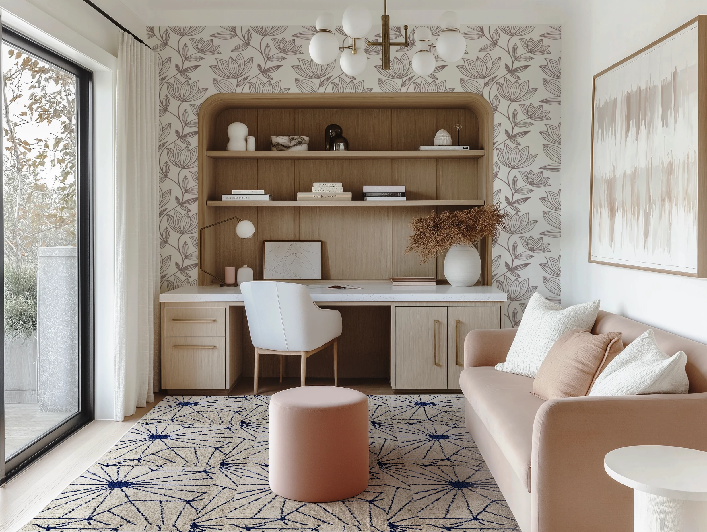 Blush-toned upholstery and flowing white curtains complement the floral wallpaper, light wood floors and cabinetry in this modern home office. Sample these materials to bring the look home.